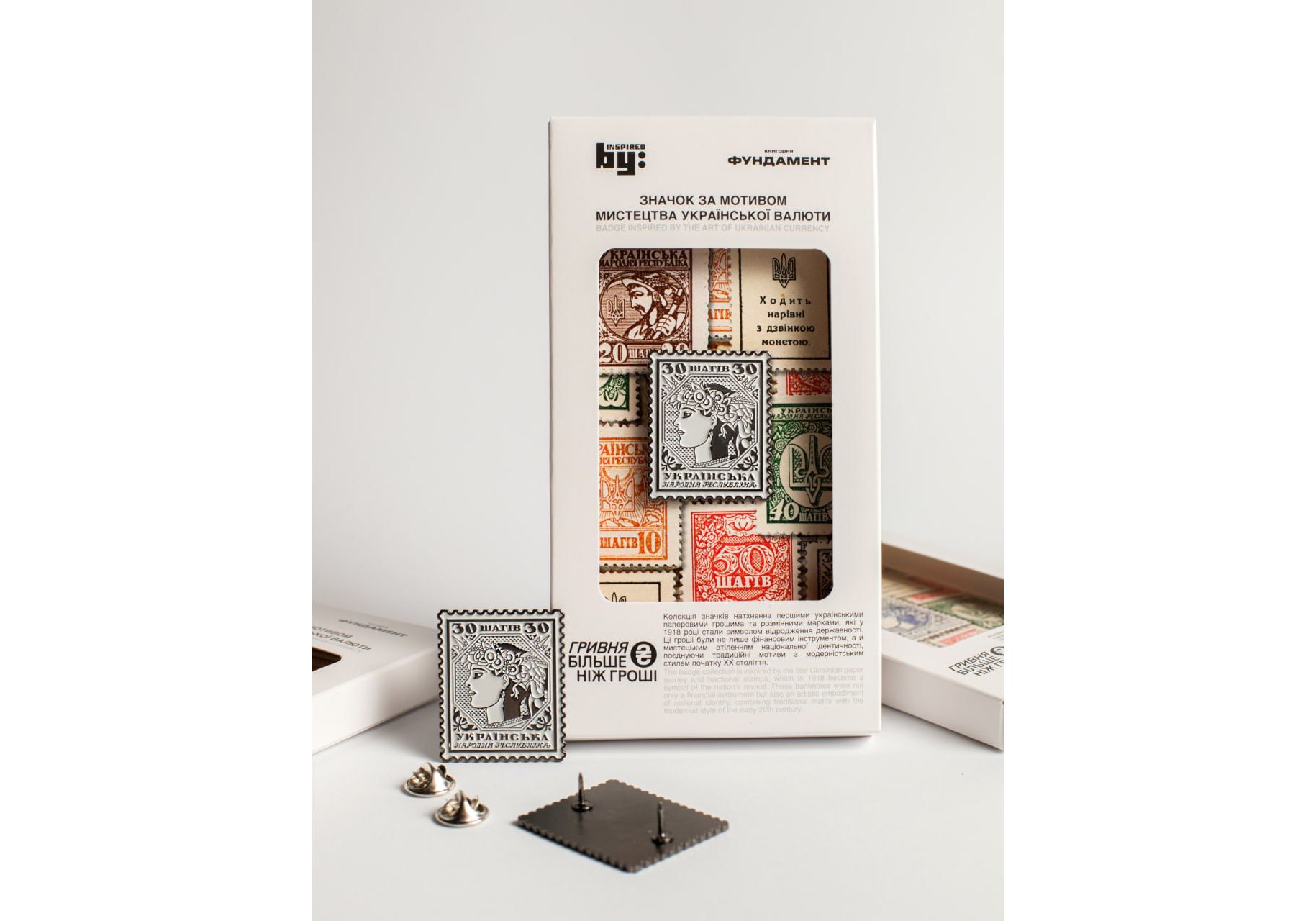 Значок "Шаги" Нова колекція пінів від inspiredby_ua та книгарні fundament.books. Натхненні творчістю Василя Кричевського та Георгія Нарбута. Шаги — стриманий, але глибоко символічний. Це відтворення ескізу Василя Кричевського 1918 року, створеного для проєкту банкноти номіналом 2 гривні часів УНР. Згодом цей ескіз було передано до Державної друкарні в Берліні, де його втілили у зелено-жовтій гамі. Пін містить зображення святого дерева з п’ятьма хвилястими гілочками по обидва боки від стовбура — символ, що прикрашав аверс банкноти. Матеріал - латунь з елементами кольорової глазурі та кріпленням "метелик".