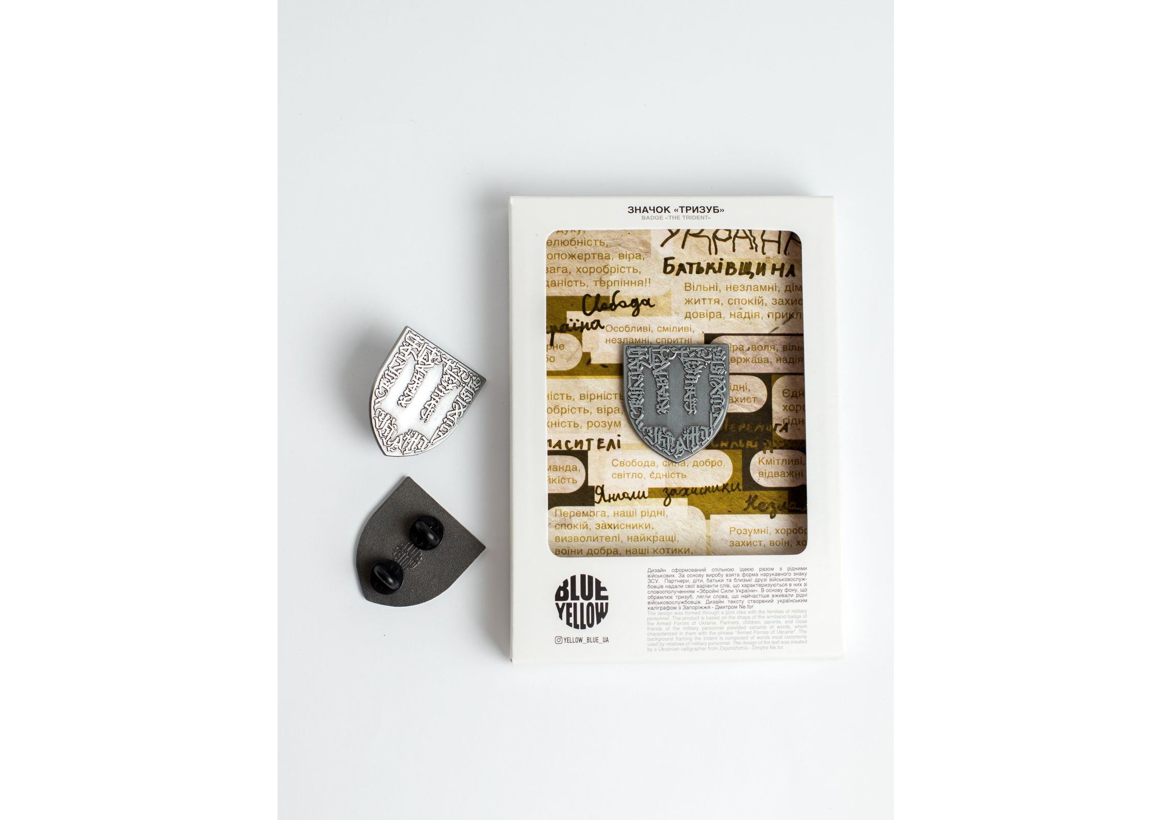 Лімітований металевий 3D значок «Тризуб.ЗСУ» Дизайн сформований спільною ідеєю разом з рідними військових. За основу виробу взята форма нарукавного знаку ЗСУ. Партнери, діти, батьки та близькі друзі військовослужбовців надали свої варіанти слів, що характеризуються в них зі словосполученням -Збройні Сили України», В основу фону, що обрамлює тризуб, лягли слова, що найчастіше вживали рідні військовослужбовців. Дизайн тексту створений українським каліграфом з Запоріжжя - Дмитром Ne.for Матеріал - латунь з елементами кольорової глазурі та кріпленням "метелик". Розмір виробу: 32*36mm