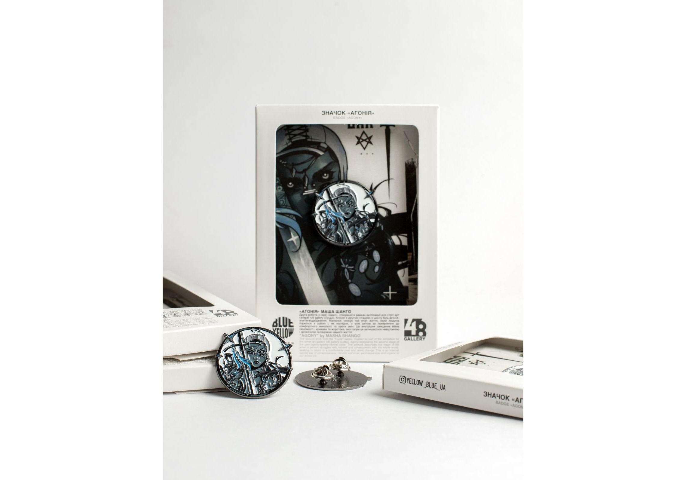 Значок за мотивами графіті «АГОНІЯ» МАШИ ШАНГО Друга робота з серії «Цикл», створеної в рамках експозиції для стріт арт галереї 4/8 gallery (Луцьк). Агонія є другою стадією з циклу біль-агонія-апатія-відродження. Малюнок описує той етап життя, коли людина бореться з собою і, як наслідок, з усім світом за повернення до комфортного минулого та проти змін. Це внутрішня священна війна свідомості - кривава та жорстока, яка попри це залишається невід?ємною і органічною складовою нашого життя. Матеріал - латунь з елементами кольорової глазурі та кріпленням "метелик". Розмір виробу: 37mm