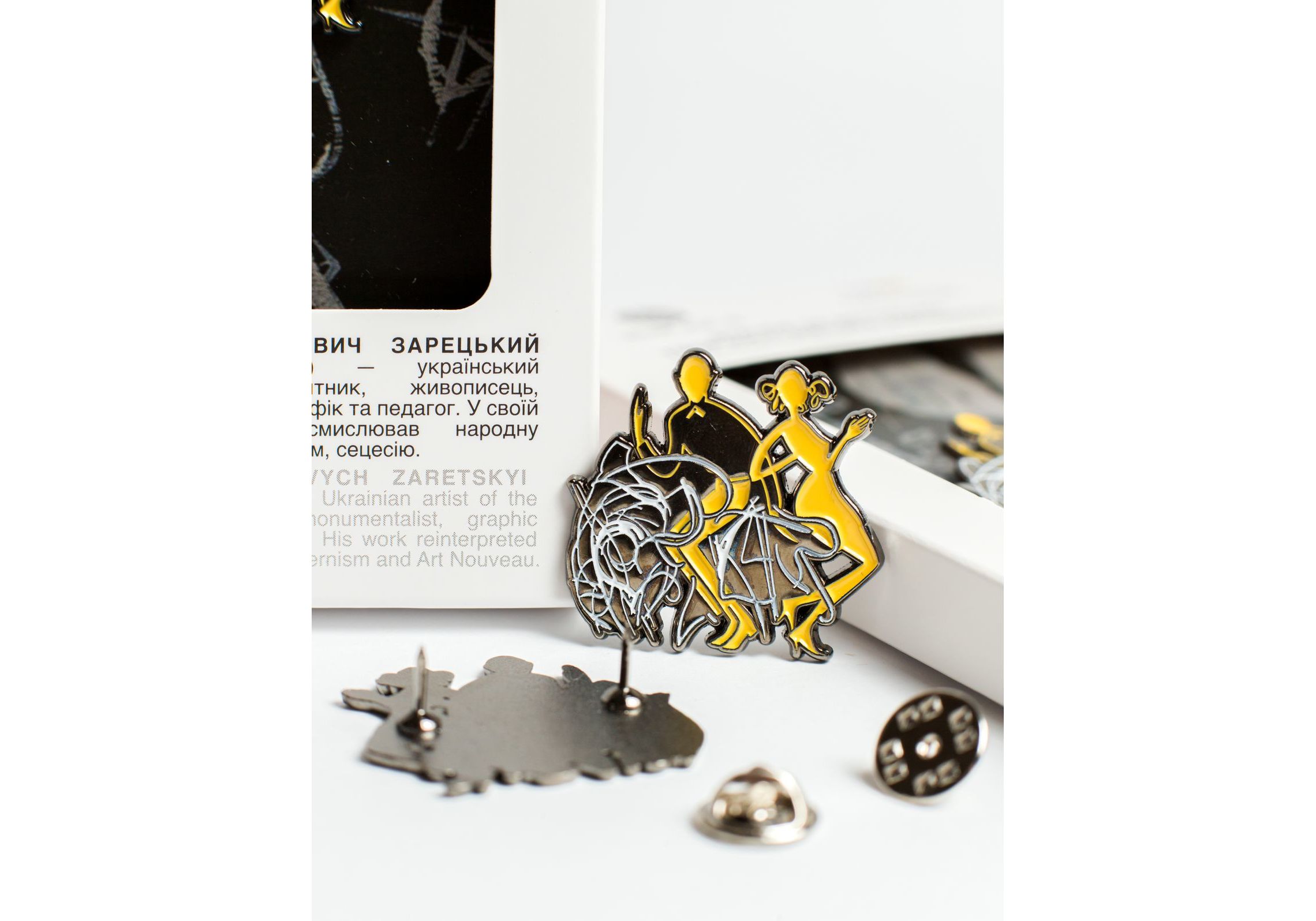 Значок за мотивами картини «ТВІСТ», створений в колаборації з фондом АЛЛИ ГОРСЬКОЇ Та ВІКТОРА ЗАРЕЦЬКОГО. BIKTOP ІВАНОВИЧ ЗАРЕЦЬКИЙ (1925- 1990) - український художник-шістдесятник, живописець, монументаліст, графік та педагог. У своїй творчості переосмислював естетику, модернізм, сецесію. Матеріал - латунь з елементами кольорової глазурі та кріпленням "метелик". Розмір виробу: 32mm