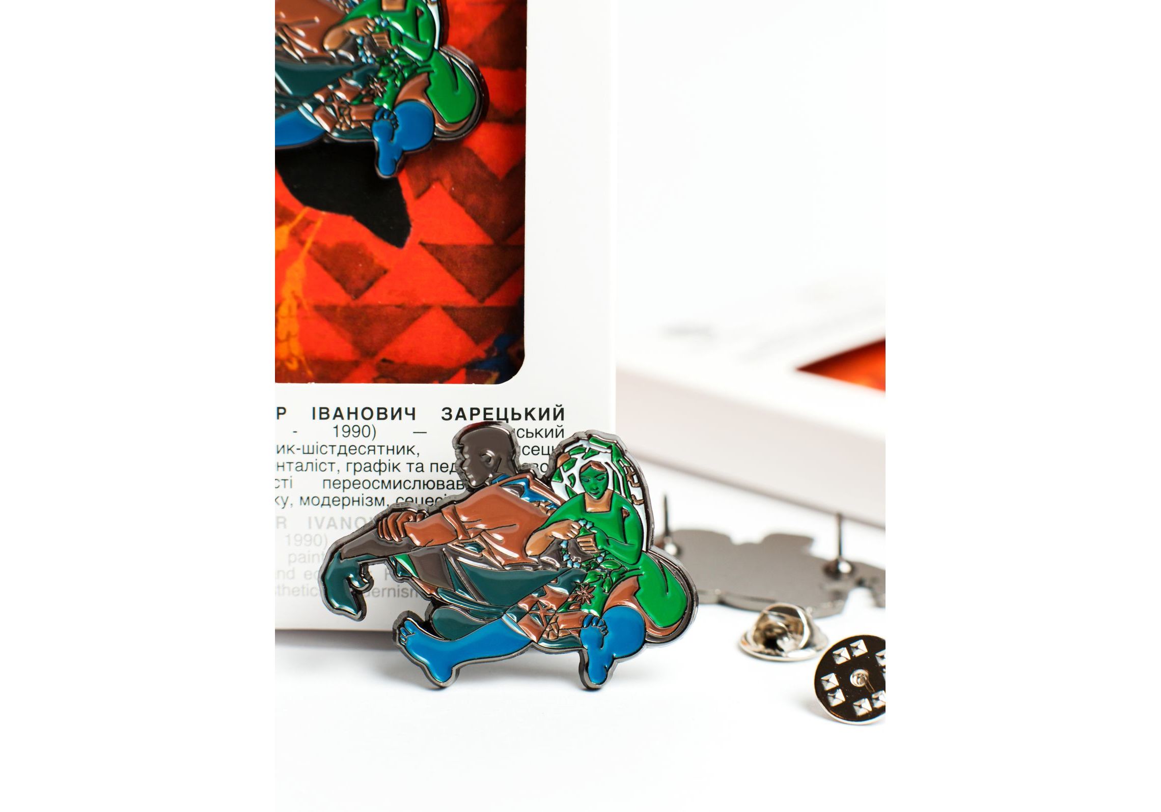 Значок за мотивами картини «ВИШНЕВИЙ ВІТЕР», створений в колаборації з фондом АЛЛИ ГОРСЬКОЇ Та ВІКТОРА ЗАРЕЦЬКОГО. BIKTOP ІВАНОВИЧ ЗАРЕЦЬКИЙ (1925- 1990) - український художник-шістдесятник, живописець, монументаліст, графік та педагог. У своїй творчості переосмислював естетику, модернізм, сецесію. Матеріал - латунь з елементами кольорової глазурі та кріпленням "метелик". Розмір виробу: 44mm