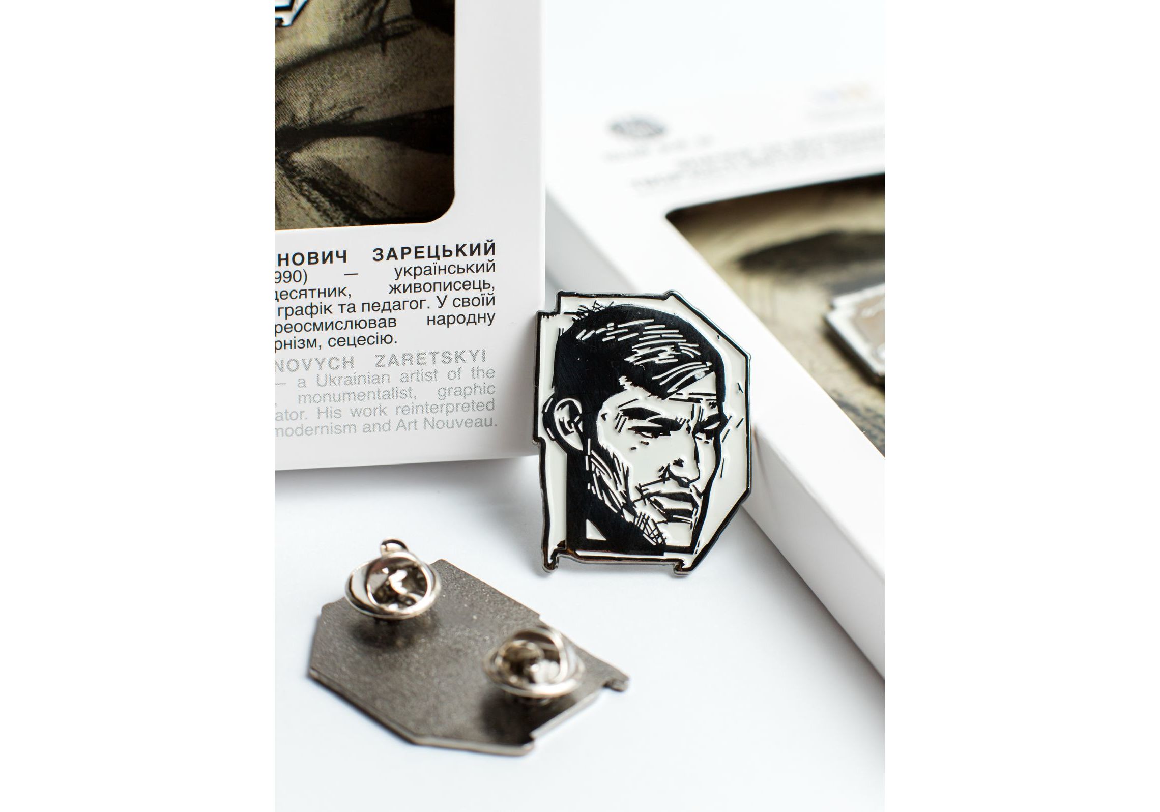 Значок за мотивами роботи «ПОРТРЕТ ВАСИЛЯ СТУСА», створений в колаборації з фондом АЛЛИ ГОРСЬКОЇ Та ВІКТОРА ЗАРЕЦЬКОГО. BIKTOP ІВАНОВИЧ ЗАРЕЦЬКИЙ (1925- 1990) - український художник-шістдесятник, живописець, монументаліст, графік та педагог. У своїй творчості переосмислював естетику, модернізм, сецесію. Матеріал - латунь з елементами кольорової глазурі та кріпленням "метелик". Розмір виробу: 34mm