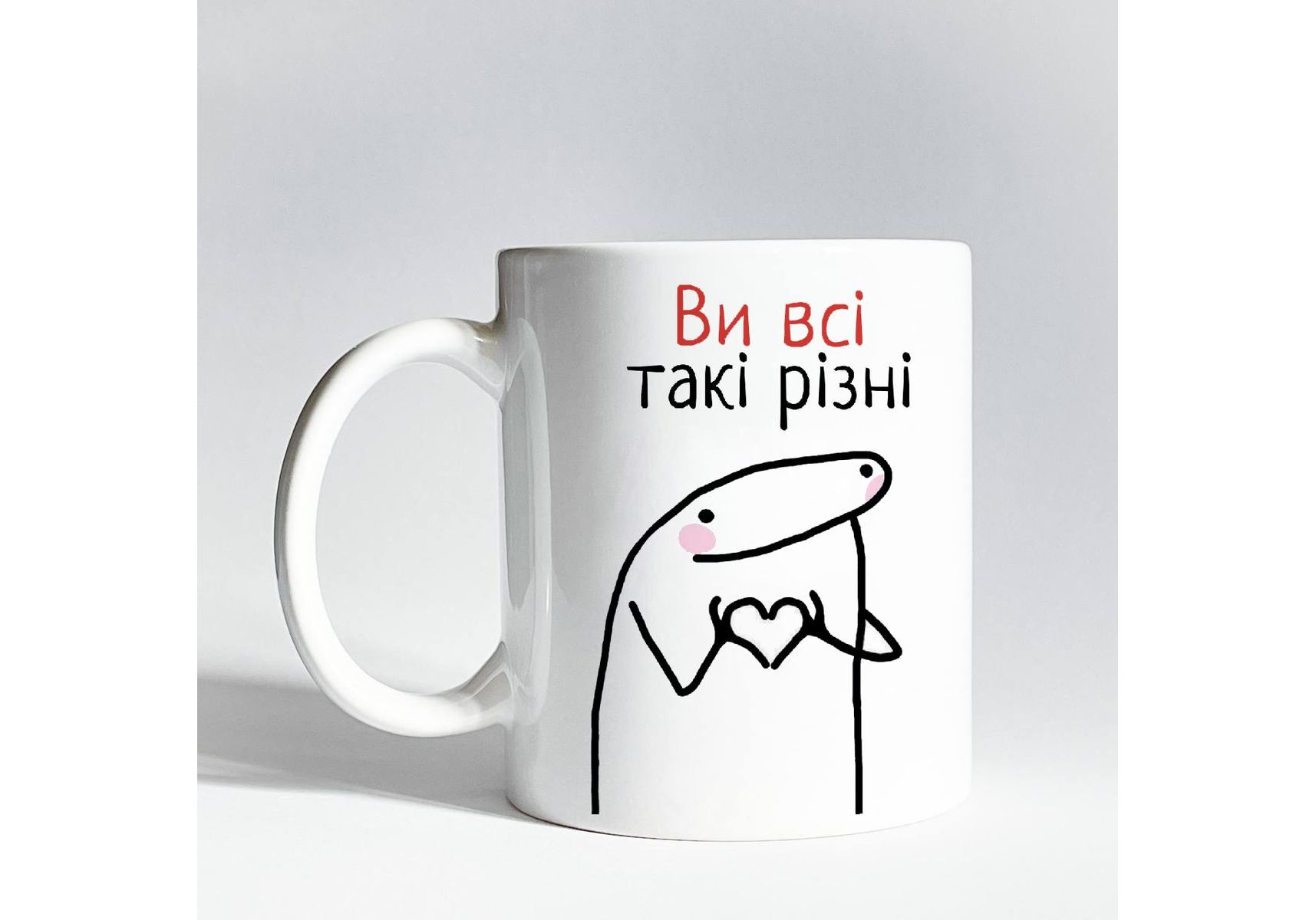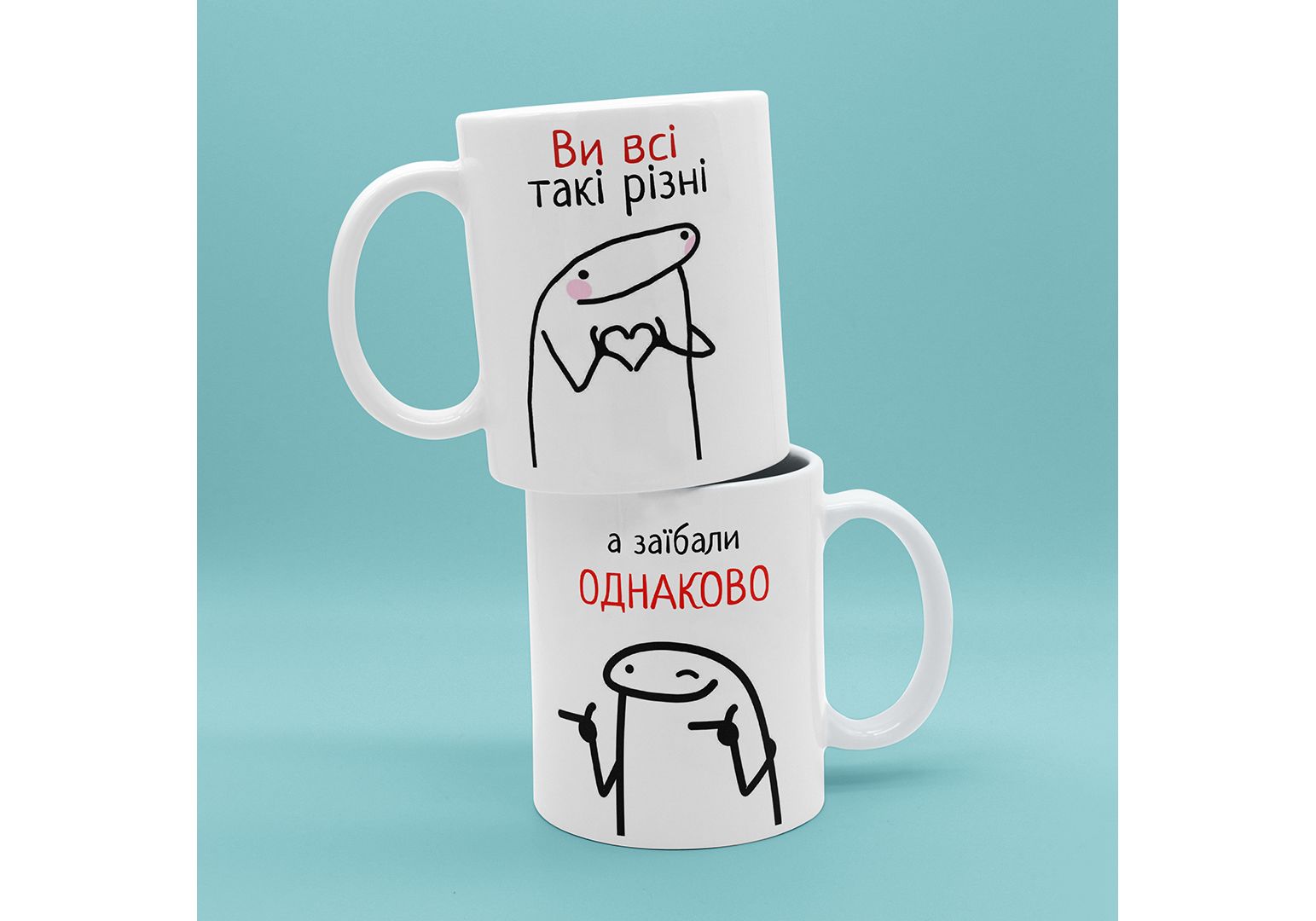 Звучить як весела та крайньо специфічна чашка, яка може підняти настрій і викликати посмішку навіть у темні часи. Ця чашка із написом "Ви всі такі різні, а за*бали однаково" відображає дух іронії та гумору, а також підкреслює унікальність кожної особистості. Це чудовий подарунок для тих, хто цінує нестандартність та вміє посміятися над життєвими ситуаціями. Додайте цю чашку до своєї колекції або подаруйте її другу, щоб подарувати порцію гарного настрою та гумору!