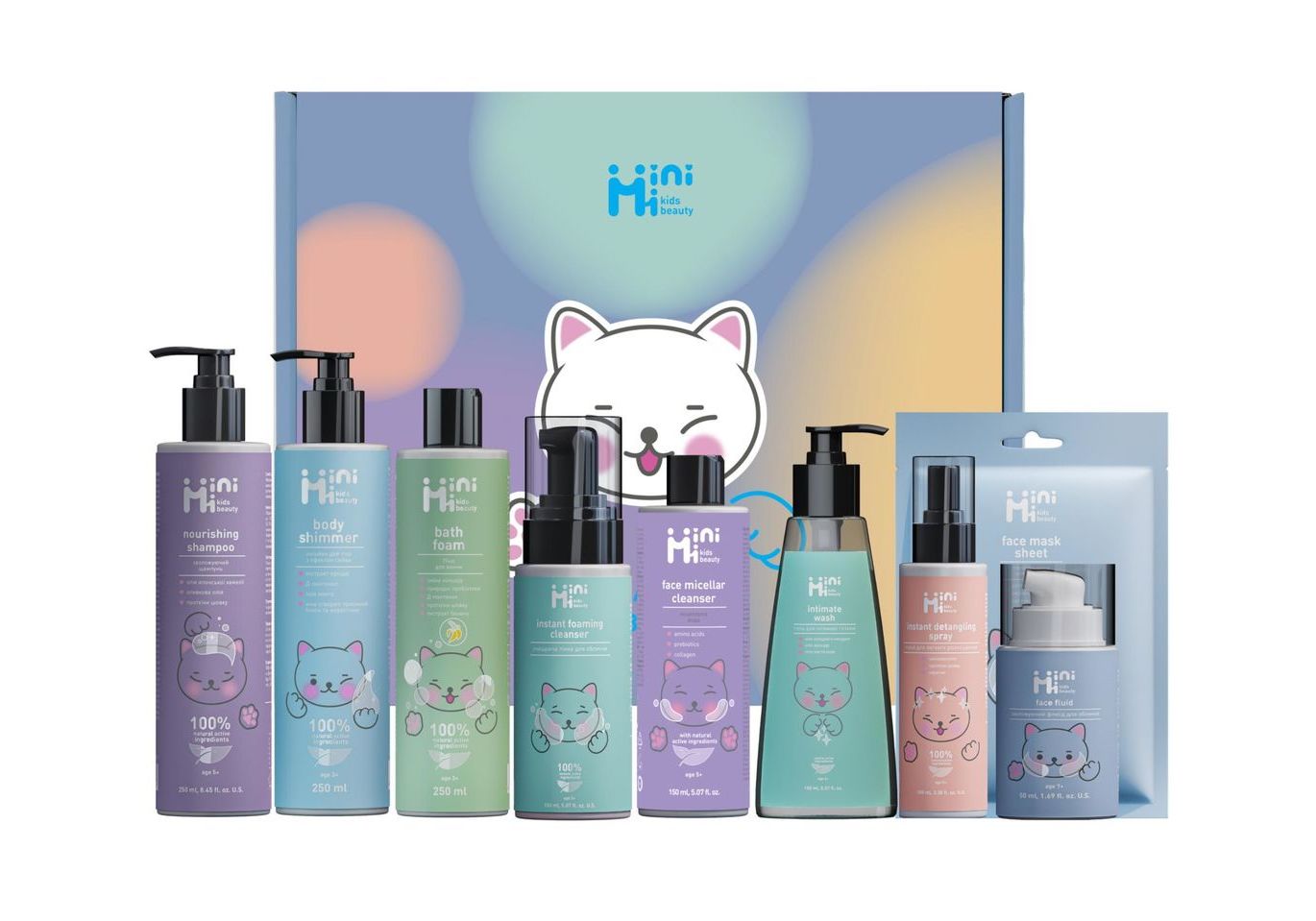 MiniMi Kids Beauty Box – великий набір із 9 засобів, які забезпечують повний догляд за тілом, волоссям і обличчям дитини. Тут є все необхідне для щоденних ритуалів краси: маска для обличчя, шампунь, кондиціонер, спрей для розчісування, піна для ванни, міцелярна вода, очищуюча пінка, зволожувальний флюїд, лосьйон для тіла та гель для інтимної гігієни. Тканинна маска для обличчя – зволожує, живить, заспокоює та захищає. Гель для інтимної гігієни – м’яке очищення, підтримка природного pH, збагачений пребіотиками та алое вера. Спрей для легкого розчісування – миттєво розплутує волосся, додає блиску й шовковистості. Зволожуючий шампунь – ніжно очищає, відновлює та зміцнює волосся завдяки кератину та шовку. Піна для ванни «Банан» – створює яскравий аромат і пінну вечірку, зволожує та заспокоює шкіру. Лосьйон для тіла з ефектом сяйва – живить, зволожує та надає легкого блиску. Очищуюча пінка для обличчя – делікатно очищає, заспокоює й робить шкіру м’якою. Міцелярна вода – освіжає, знімає забруднення й макіяж без пересушування. Зволожувальний флюїд для обличчя – легка текстура, яка миттєво зволожує та захищає шкіру. Цей набір стане чудовим подарунком для дітей і підлітків, допоможе сформувати корисні звички догляду та перетворить буденність на справжнє маленьке SPA вдома.