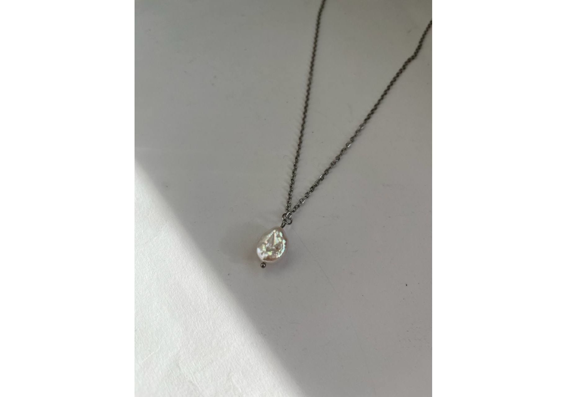 Ланцюжок з натуральною перлиною барокко в срібному кольорі. Фурнітура - латунь покрита родієм (метал платинової групи) та ювелірна сталь Довжина ланцюжка- 47 см+ ланцюжок-подовжувач -5 см