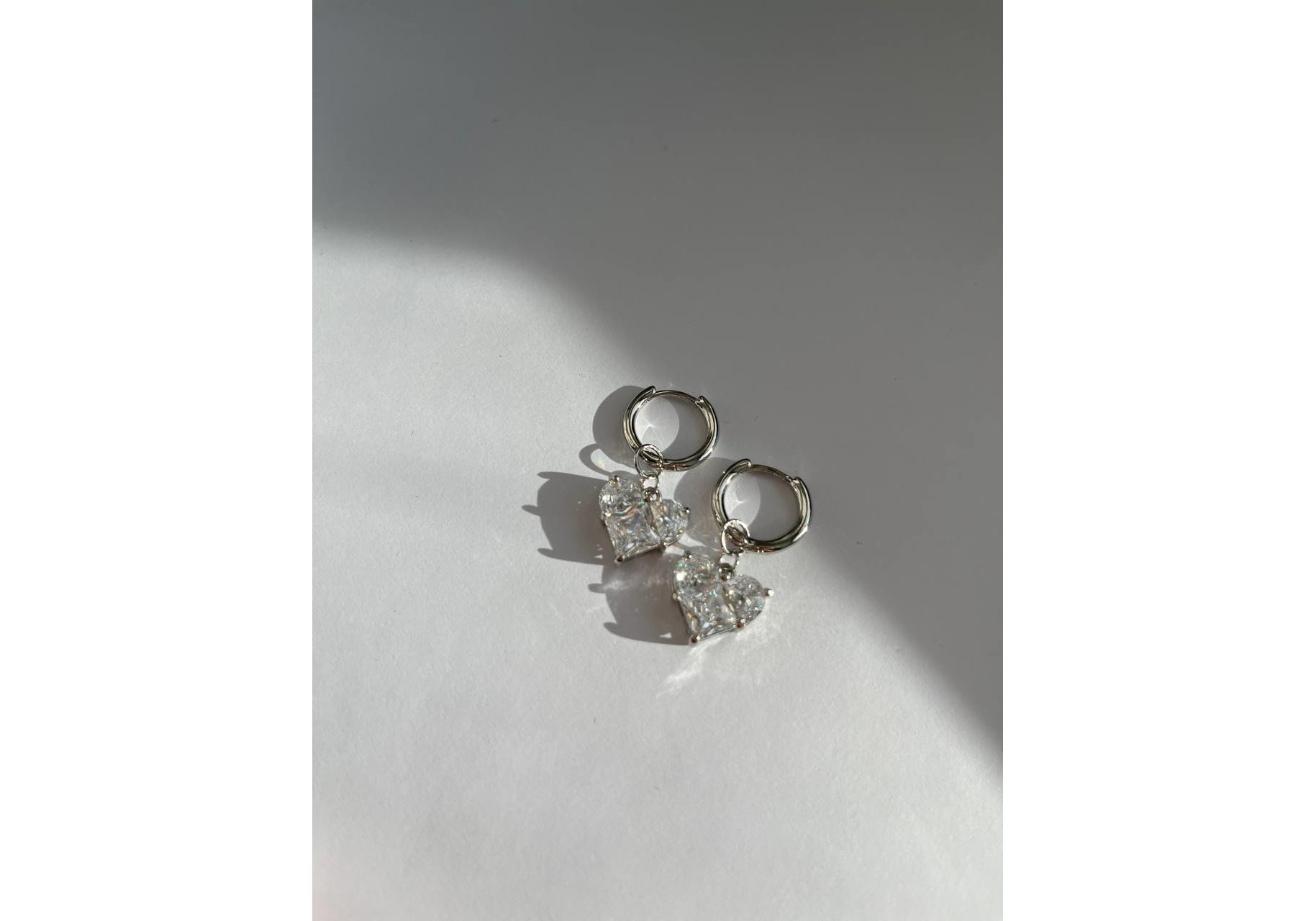 Сережки зі зйомними прозорими підвісками серце з ювелірного скла в срібному кольорі. Фурнітура - латунь покрита родієм (метал платинової групи) та ювелірна сталь