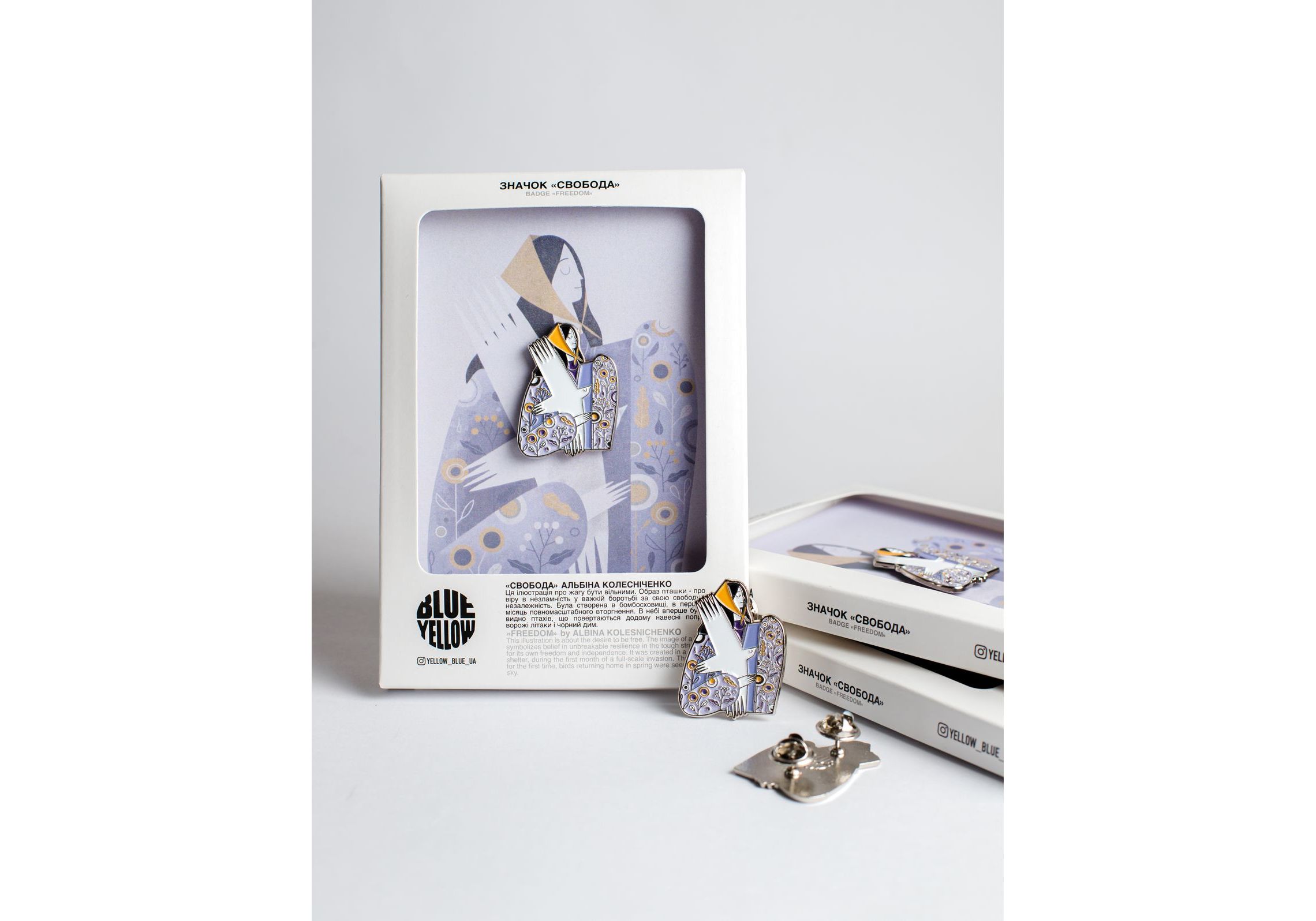 Значок за мотивами картини «СВОБОДА» АЛЬБІНИ КОЛЕСНІЧЕНКО Ця ілюстрація про жагу бути вільними. Образ пташки - про віру в незламність у важкій боротьбі за свою свободу. незалежність. Була створена в бомбосховищі, в перший місяць повномасштабного вторгнення. В небі вперше було видно птахів, що повертаються додому навесні попри ворожі літаки і чорний дим. Матеріал - латунь з елементами кольорової глазурі та кріпленням "метелик". Розмір виробу: 37mm