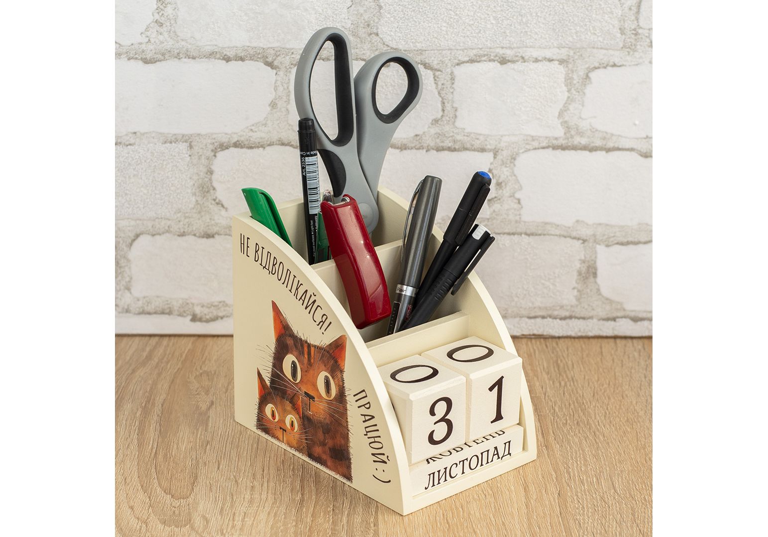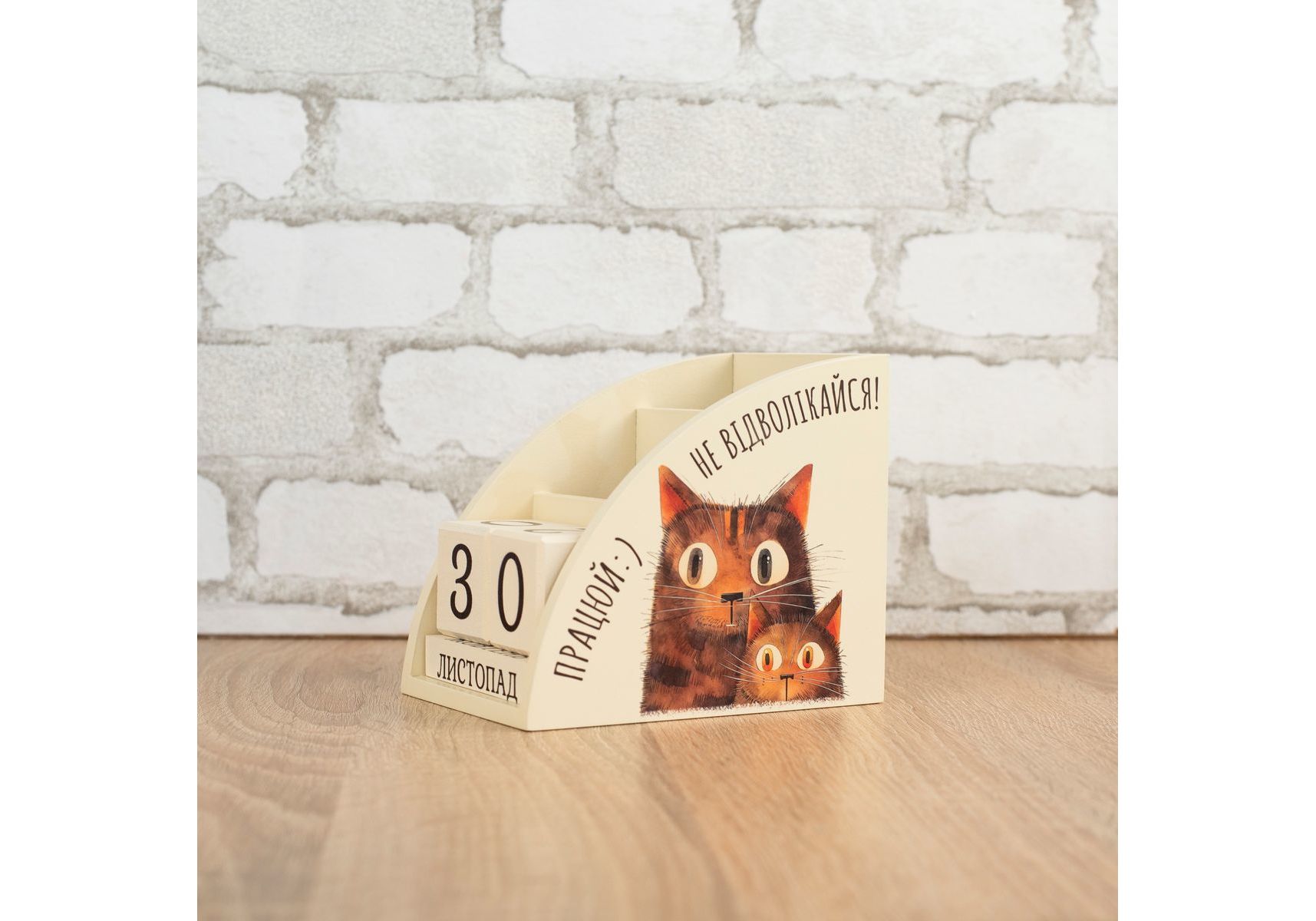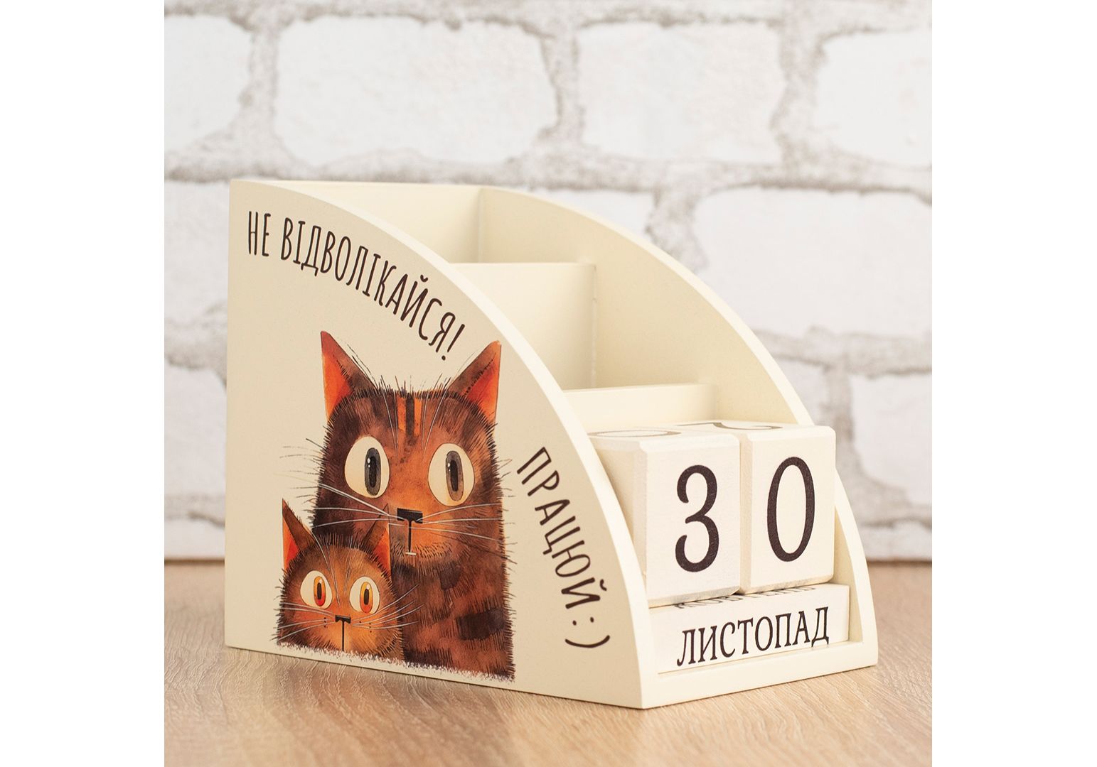 Органайзер календар виготовляється із дерева на власному виробництві. Це не лише красива, але й практична річ, що дозволить організувати місце за столом на роботі чи вдома. Два відділи для зберігання із різною висотою, що дозволять зручно складати і діставати будь-яке канцелярське приладдя. Вічний календар, представлений дерев'яними кубиками із цифрами та назвами місяців, ідеально доповнює органайзер. Календар, що слугуватиме довгі роки і даруватиме тактильну насолоду кожного дня. Підкреслити ваш настрій чи замотивувати на нові досягнення зможе наш дизайн, що розміщується на бокових стінках. Зображення наноситься за допомогою УФ-друку стійкого до вигорання та вологого прибирання. Це ідеальний подарунок для друзів, рідних чи колег.