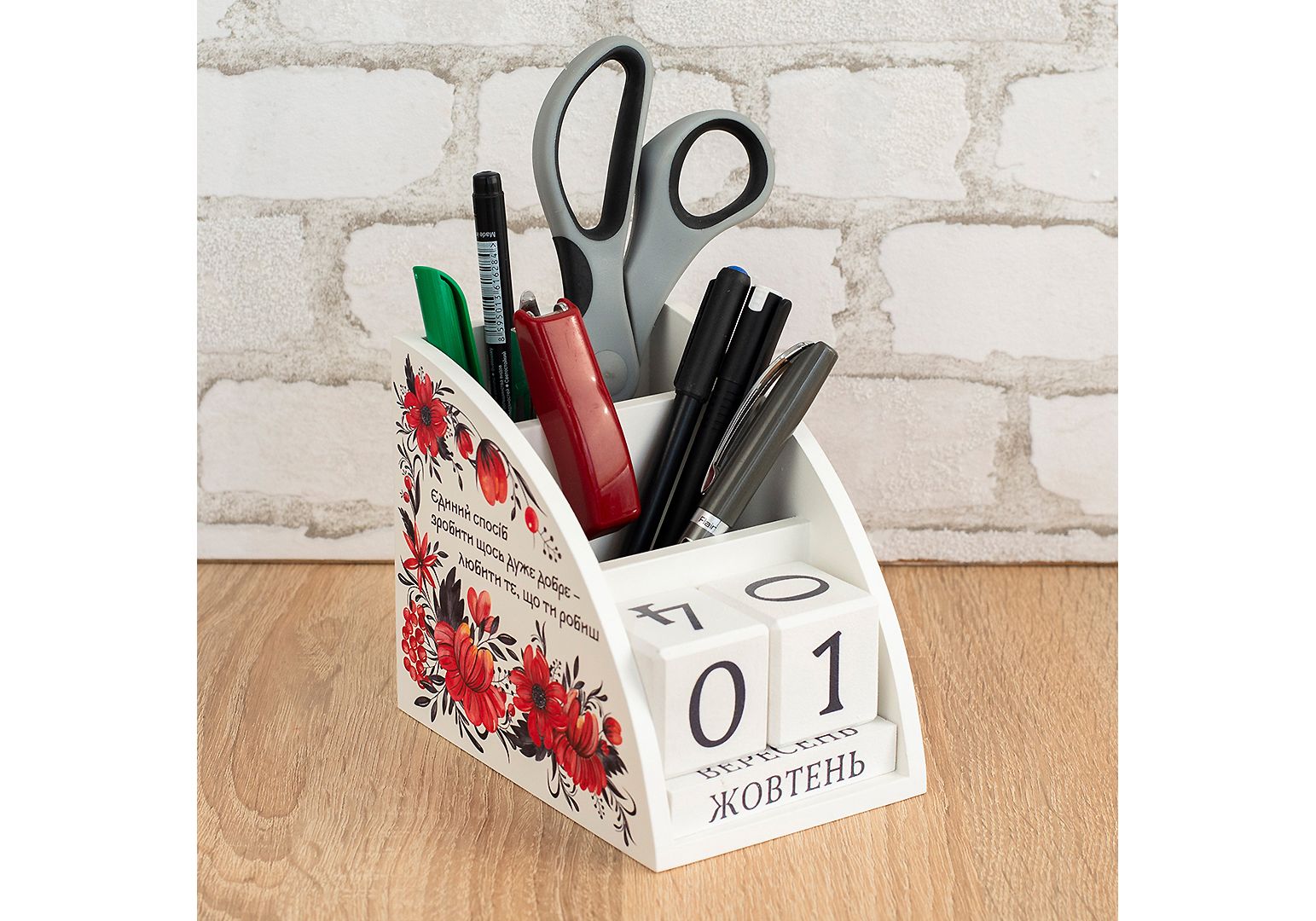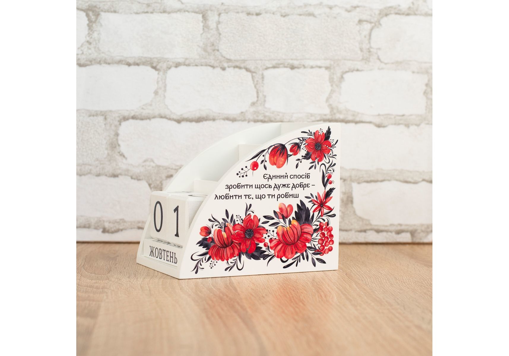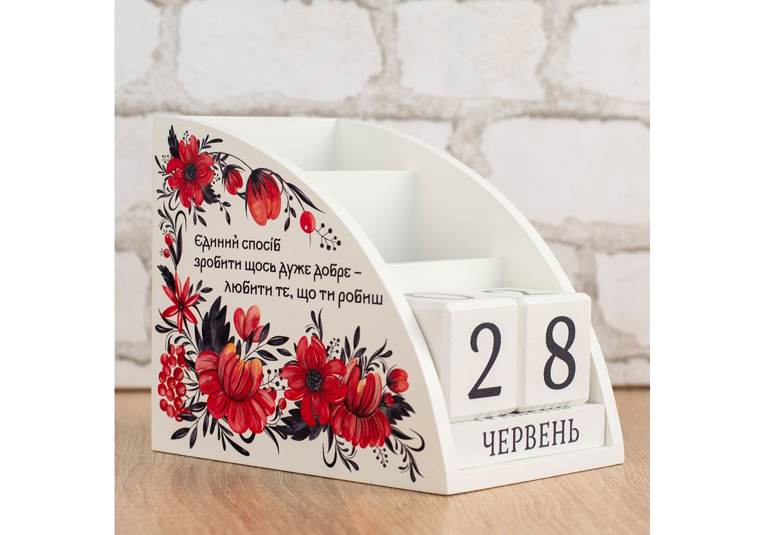 Органайзер календар виготовляється із дерева на власному виробництві. Це не лише красива, але й практична річ, що дозволить організувати місце за столом на роботі чи вдома. Два відділи для зберігання із різною висотою, що дозволять зручно складати і діставати будь-яке канцелярське приладдя. Вічний календар, представлений дерев'яними кубиками із цифрами та назвами місяців, ідеально доповнює органайзер. Календар, що слугуватиме довгі роки і даруватиме тактильну насолоду кожного дня. Підкреслити ваш настрій чи замотивувати на нові досягнення зможе наш дизайн, що розміщується на бокових стінках. Зображення наноситься за допомогою УФ-друку стійкого до вигорання та вологого прибирання. Це ідеальний подарунок для друзів, рідних чи колег.