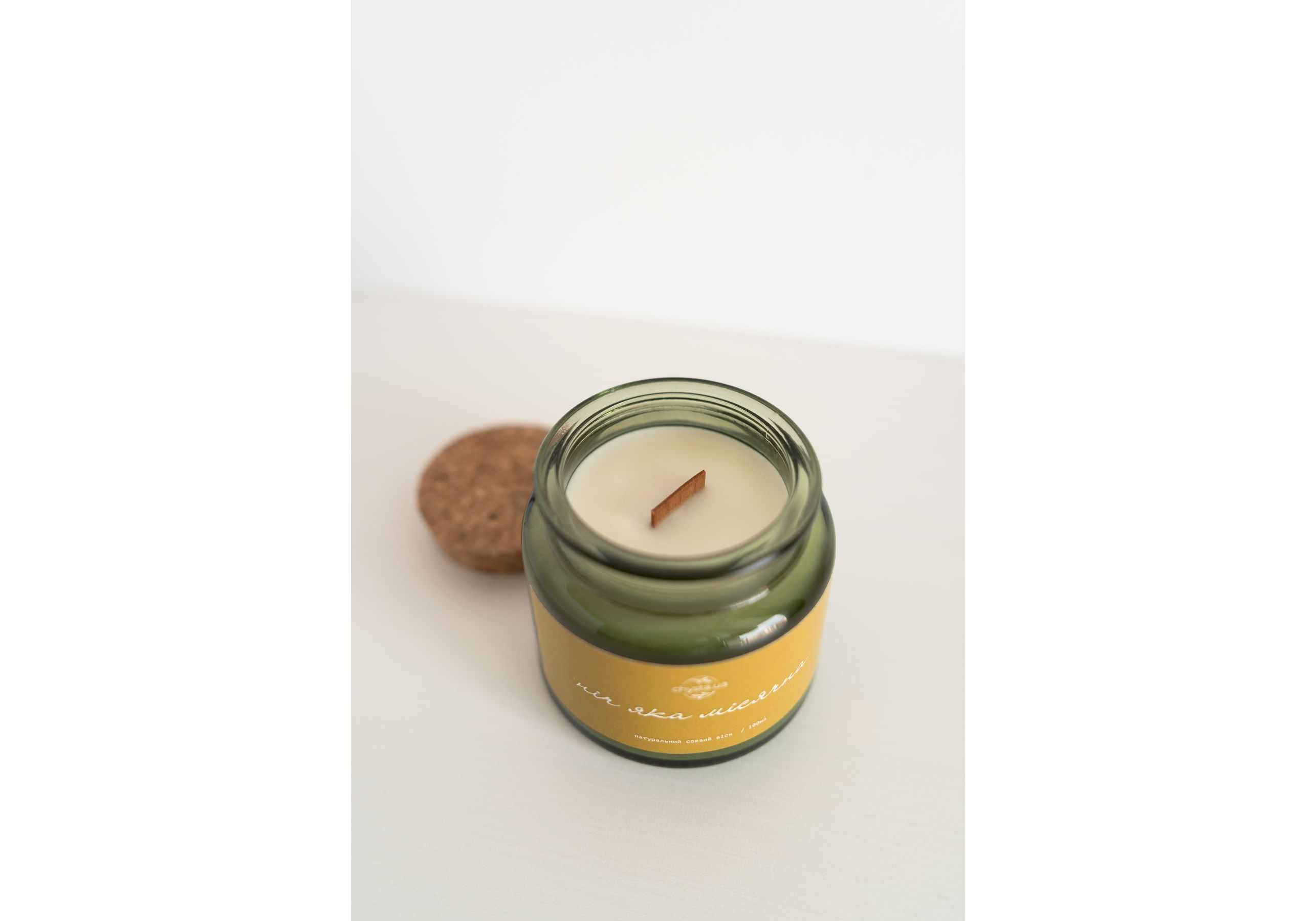 Ароматична соєва свічка з дерев'яним гнотом, яка дарує затишок. Верхні ноти: Зелене листя, Груша Ноти серця: Слива, Кориця, Цукор Базові ноти: Дим, Сандал