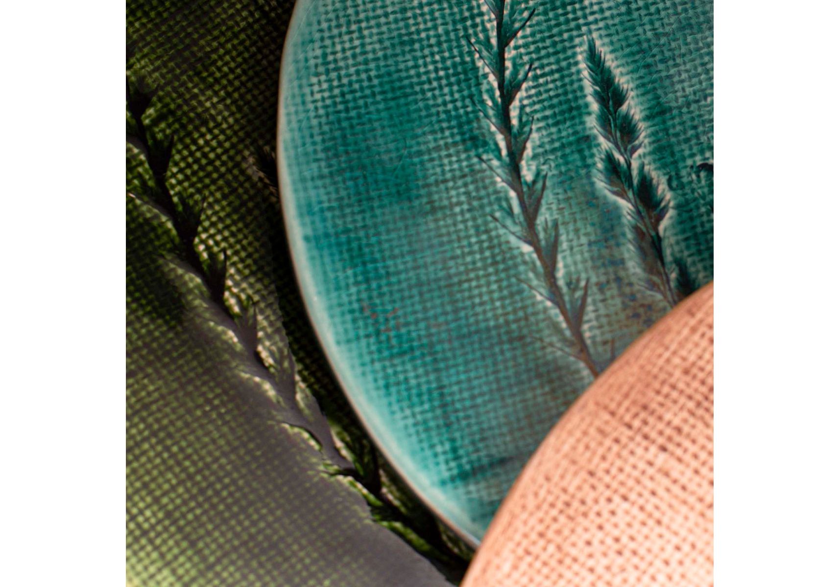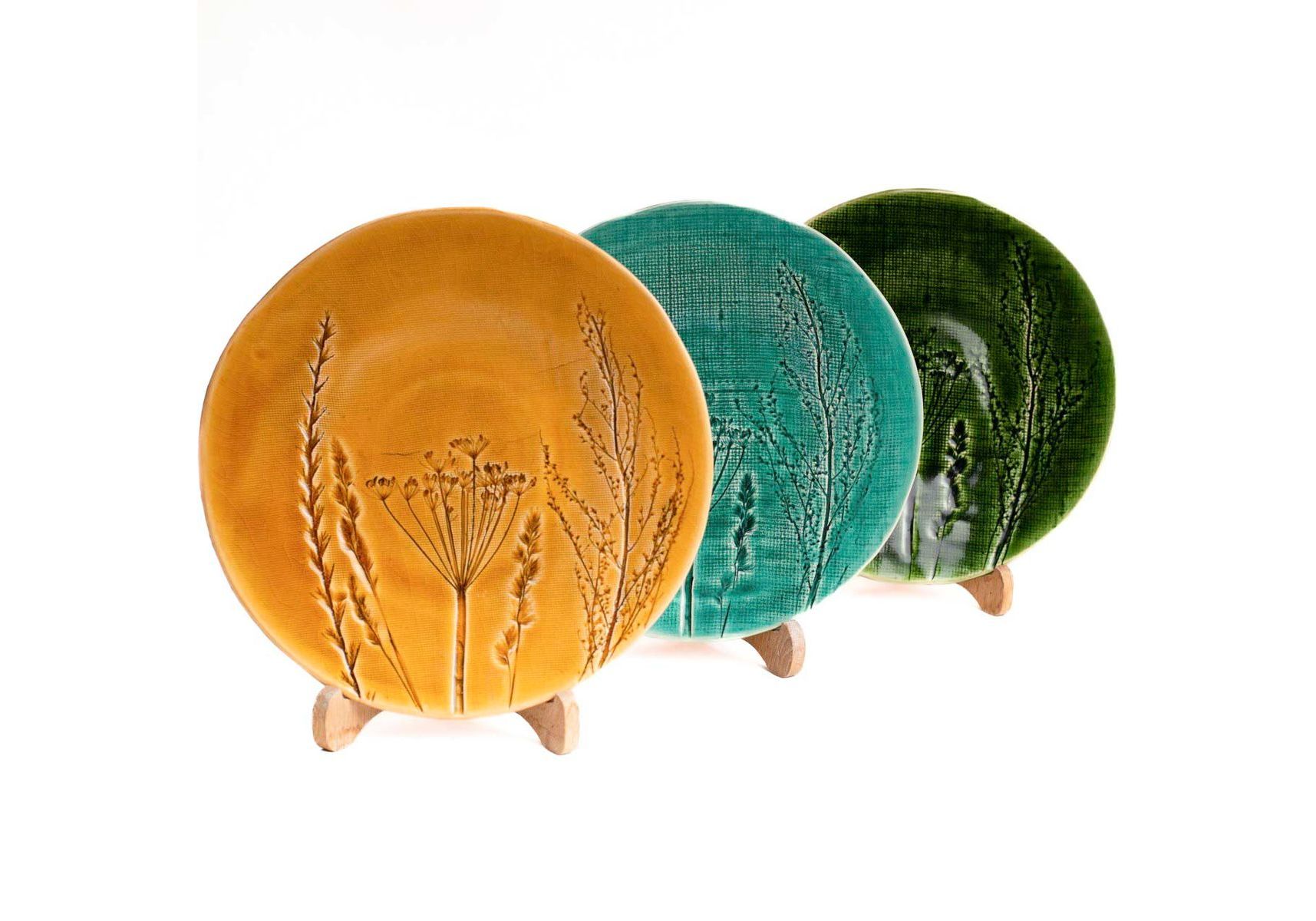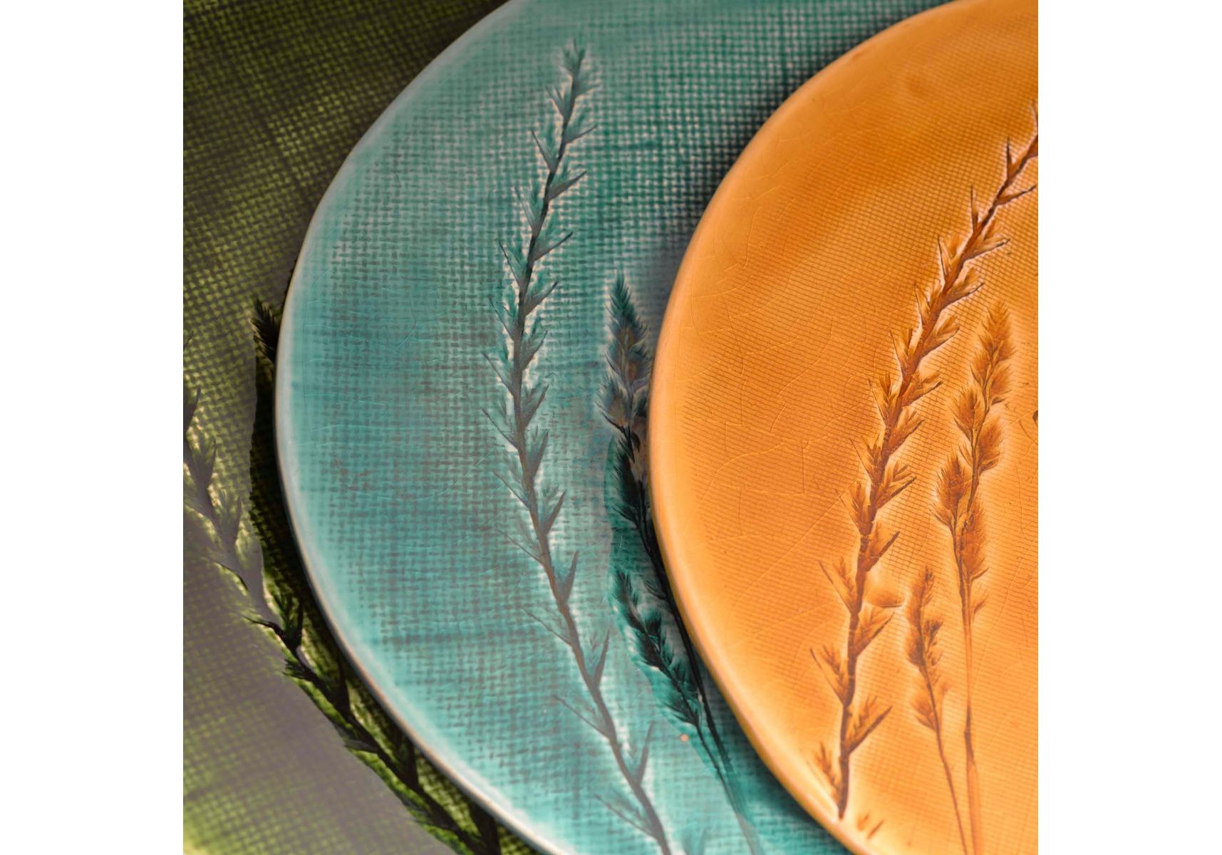 Тарілки Флора вироблені вручну українськими керамістами з відбитком рослин. Для виробництва використовується натуральна українська глина. Поливане покриття екологічне та безпечне для щоденного користування і розігрівання у мікрохвильовці чи духовці. Керамічні вироби не рекомендуємо мити у посудомийних машинах для кращого збереження кольору