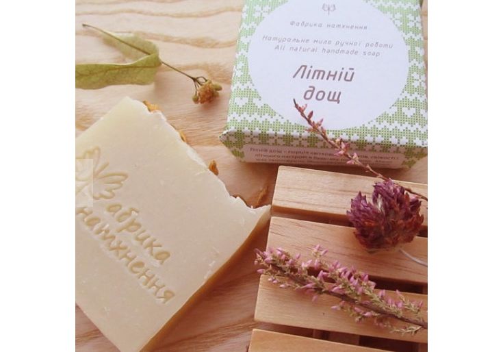 Літній дощ – порція квіткових ароматів, свіжості і літнього настрою в будь-яку пору року. Мило зварено на оливковій, кокосовій, пальмовій, касторовій і кукурудзяній олії з додаванням олії абрикосових кісточок, ефірних олій неролі, жасмину та іланг-ілангу. Мило має зволожуючу, омолоджуючу дію, підвищує еластичність шкіри і вирівнює колір обличчя.