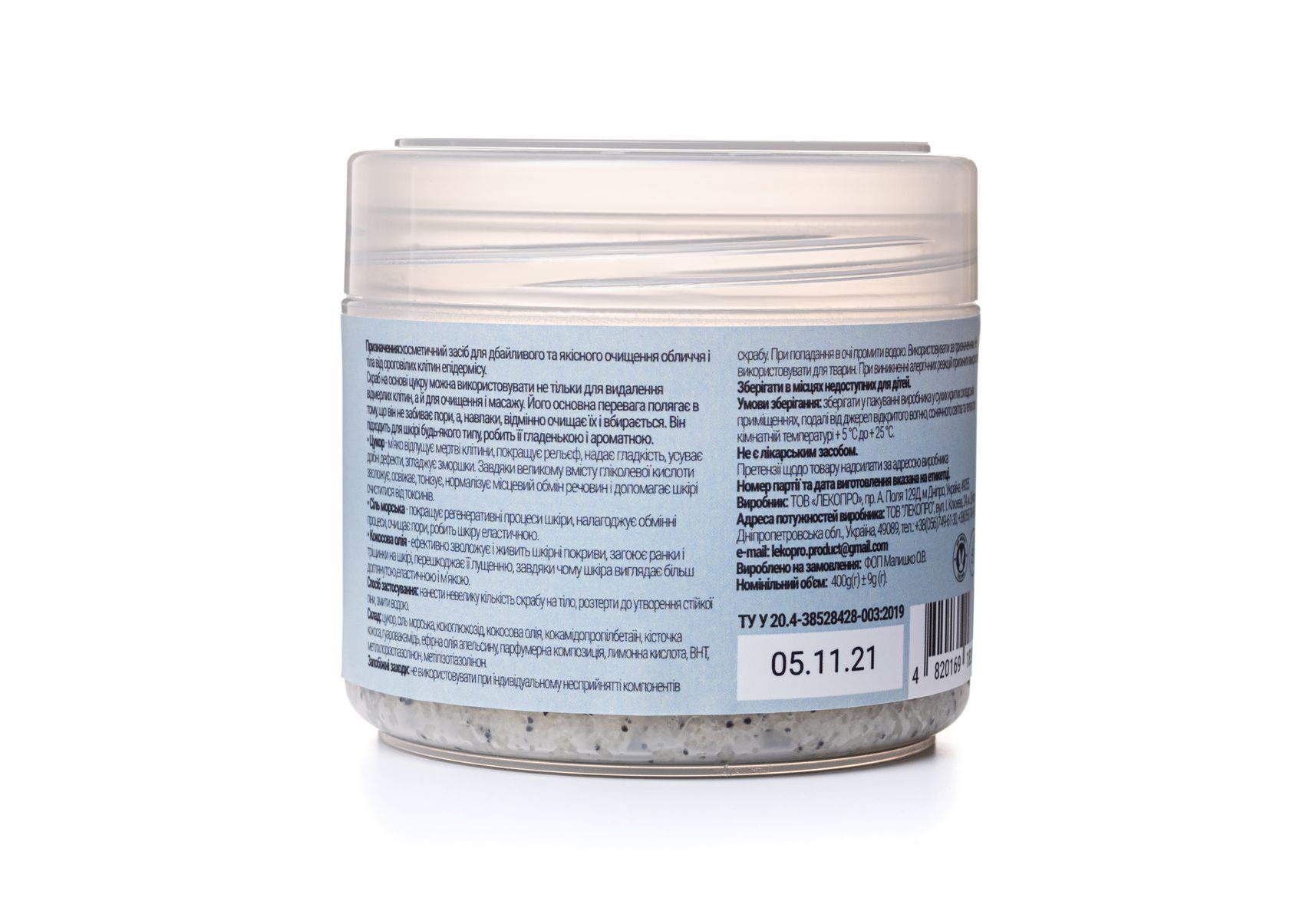 Цукровий скраб для тіла з кісточкою кокосу MG - очищення обличчя і тіла від ороговілих клітин епідермісу. Скраб на основі цукру можна використовувати не тільки для видалення відмерлих клітин, а й для очищення і масажу. Його основна перевага полягає в тому, що він не забиває пори, а, навпаки, відмінно очищає їх і вбирається. Він підходить для шкірі будь-якого типу, робить її гладенькою і ароматною. Цукор - м’яко відлущує мертві клітини, покращує рельєф, надає гладкість, усуває дрібні дефекти, згладжує зморшки. Завдяки великому вмісту гліколевої кислоти зволожує, освіжає, тонізує, нормалізує місцевий обмін речовин і допомагає шкірі очиститися від токсинів. Сіль морська - покращує регенеративні процеси шкіри, налагоджує обмінні процеси, очищає пори, робить шкіру еластичною. Кокосова олія - ефективно зволожує і живить шкірні покриви, загоює ранки і тріщинки на шкірі, перешкоджає її лущенню, завдяки чому шкіра виглядає більш доглянутою,еластичною і м’якою.