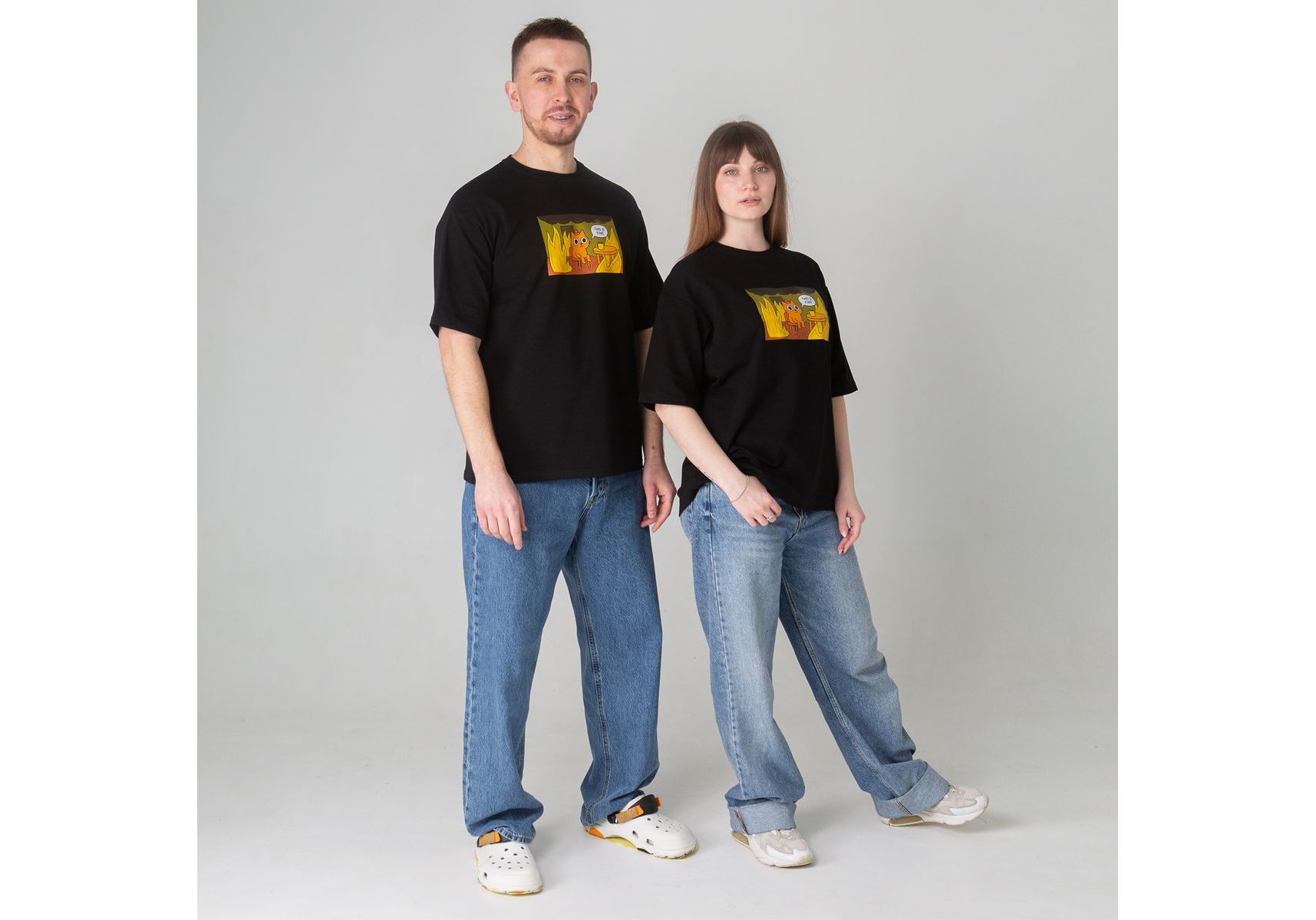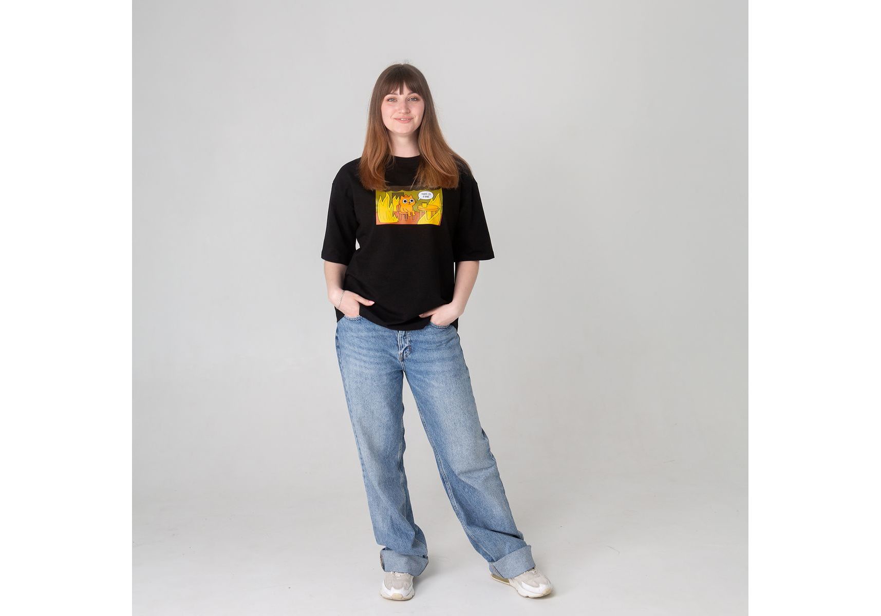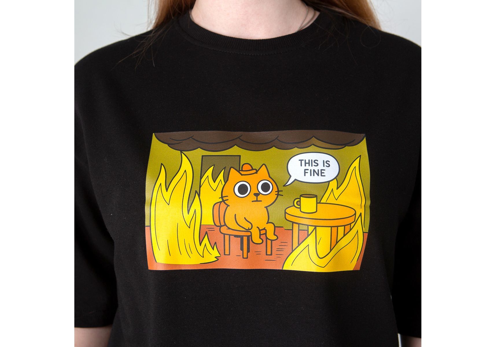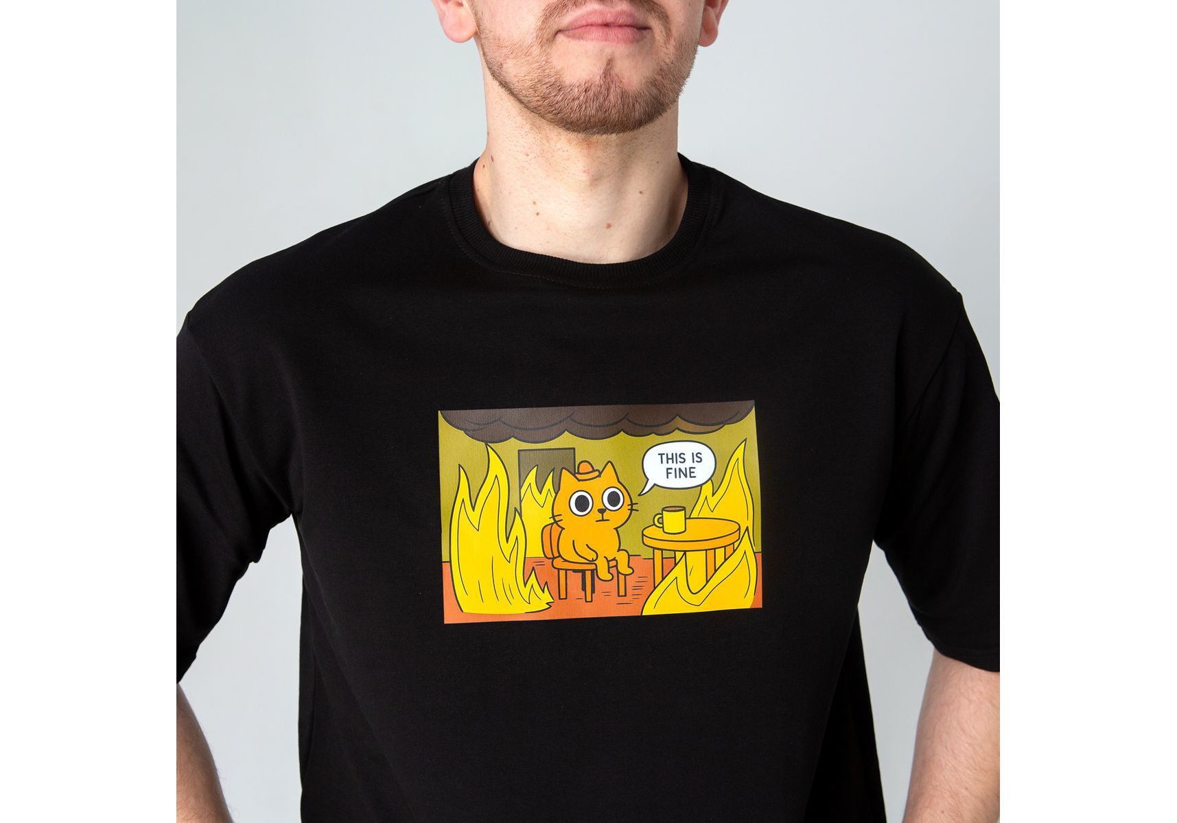 Футболка оверсайз з принтом кота This is Fine (чорна) Kitek Wear