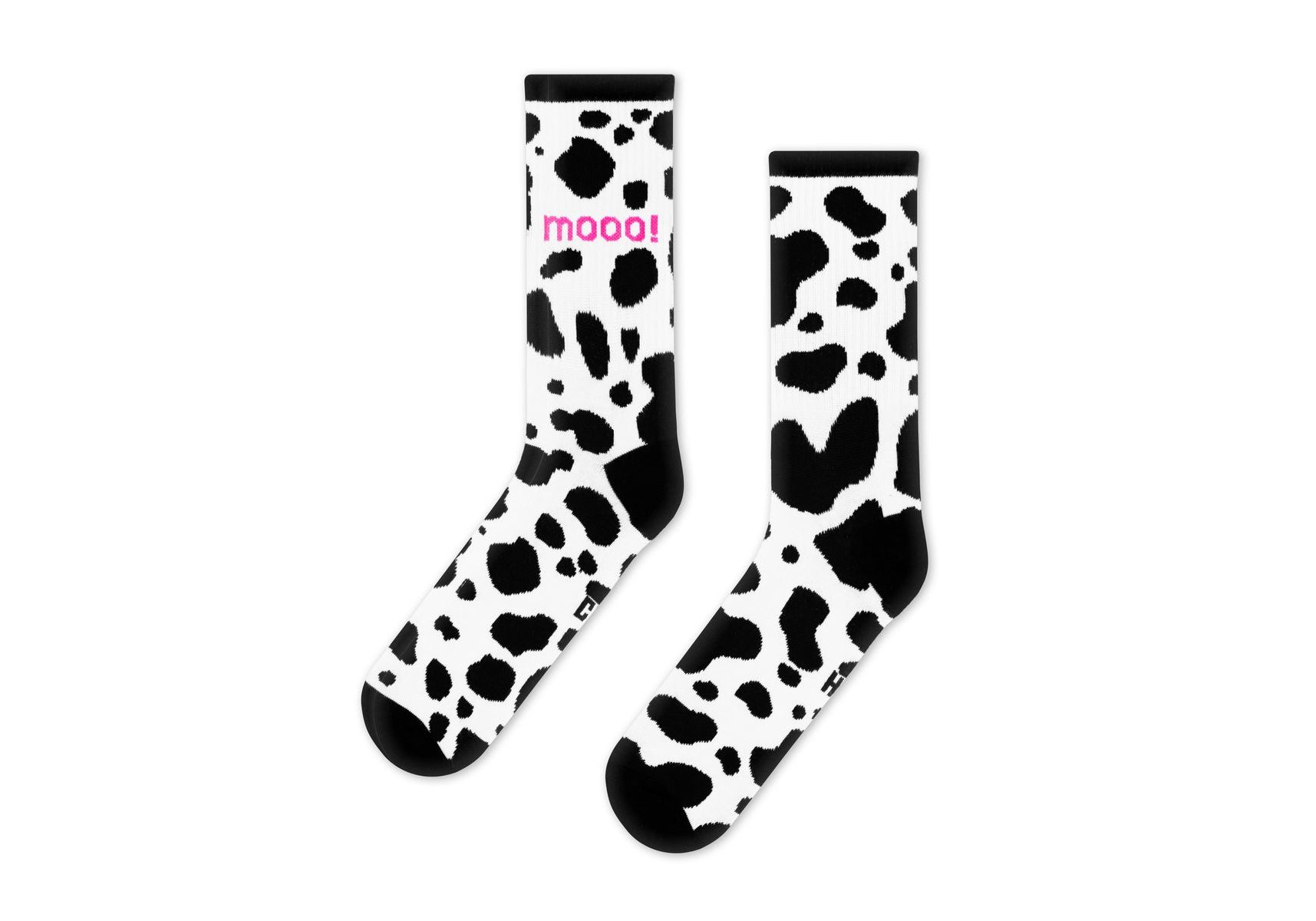 Шкарпетки з анімалістичним чорно-білим принтом «корівка» та яскравим рожевим написом. Для тих, хто не боїться показати свою тваринну натуру, навіть якщо вона не гарчить, а каже «Мууу». Жіночі та чоловічі моделі. Високі шкарпетки з натуральної 100% гребінної бавовни. Вміст бавовни – 93%, лайкри - 7%. Шкарпетки мають укріплену п’яту та мисок, високоеластичну резинку висотою 22-24 см. Це ідеальний подарунок близьким на день народження та будь-яке свято. Усі розміри в наявності.