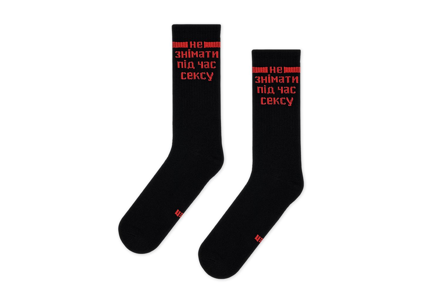 Високі чорні шкарпетки з провокативним написом для розкутих і сміливих. Рекомендується не знімати під час сексу. Жіночі та чоловічі моделі. З натуральної 100% гребінної бавовни. Вміст бавовни – 93%, лайкри - 7%. Шкарпетки мають укріплену п’яту та мисок, високоеластичну резинку висотою 22-24 см.