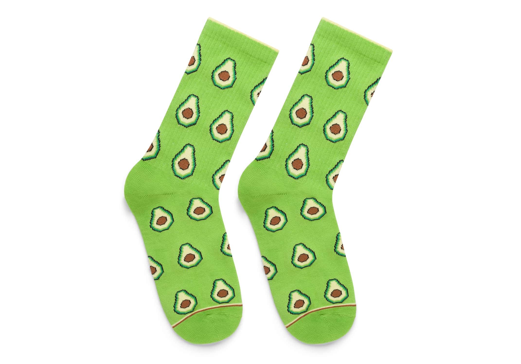 Найпопулярніші серед гурманів. Пара шкарпеток оливкового кольору з зображенням стиглого привабливого авокадо. Зроблені з високоякісної індійської еко-бавовни.