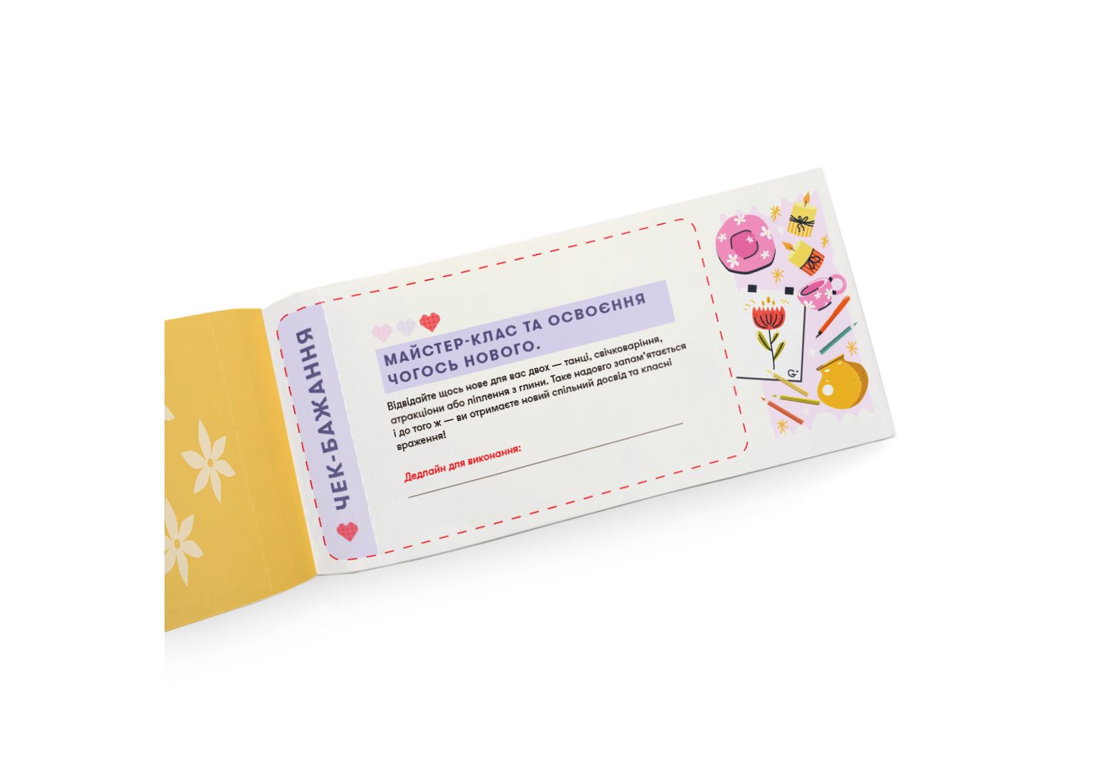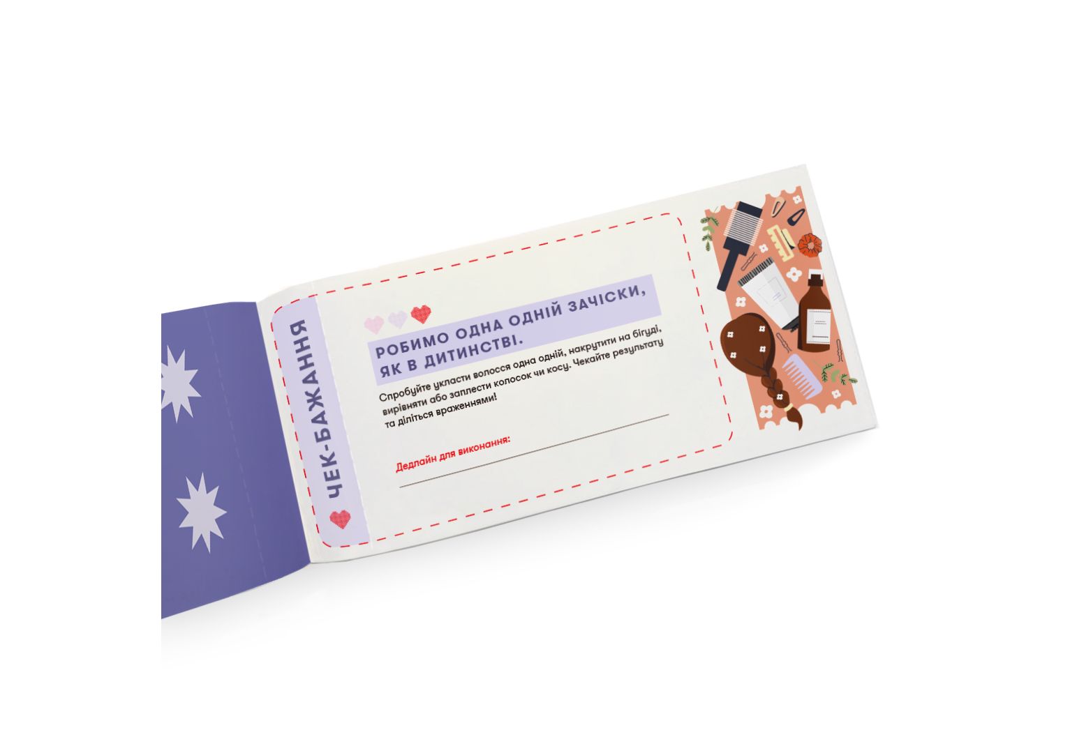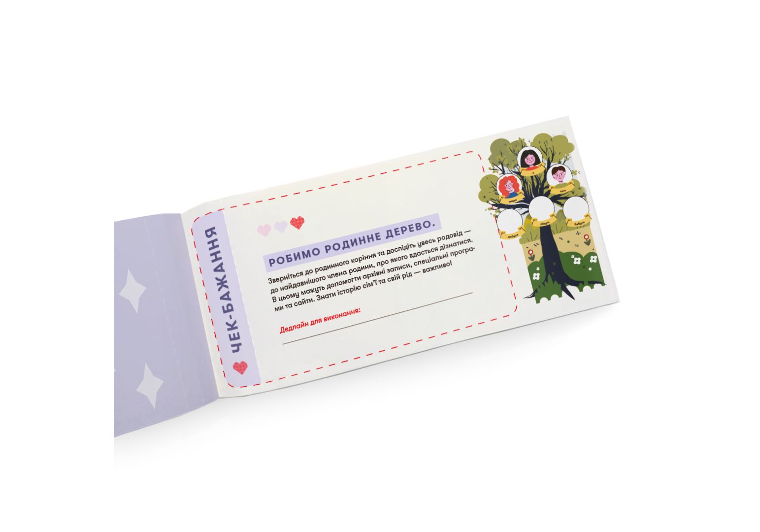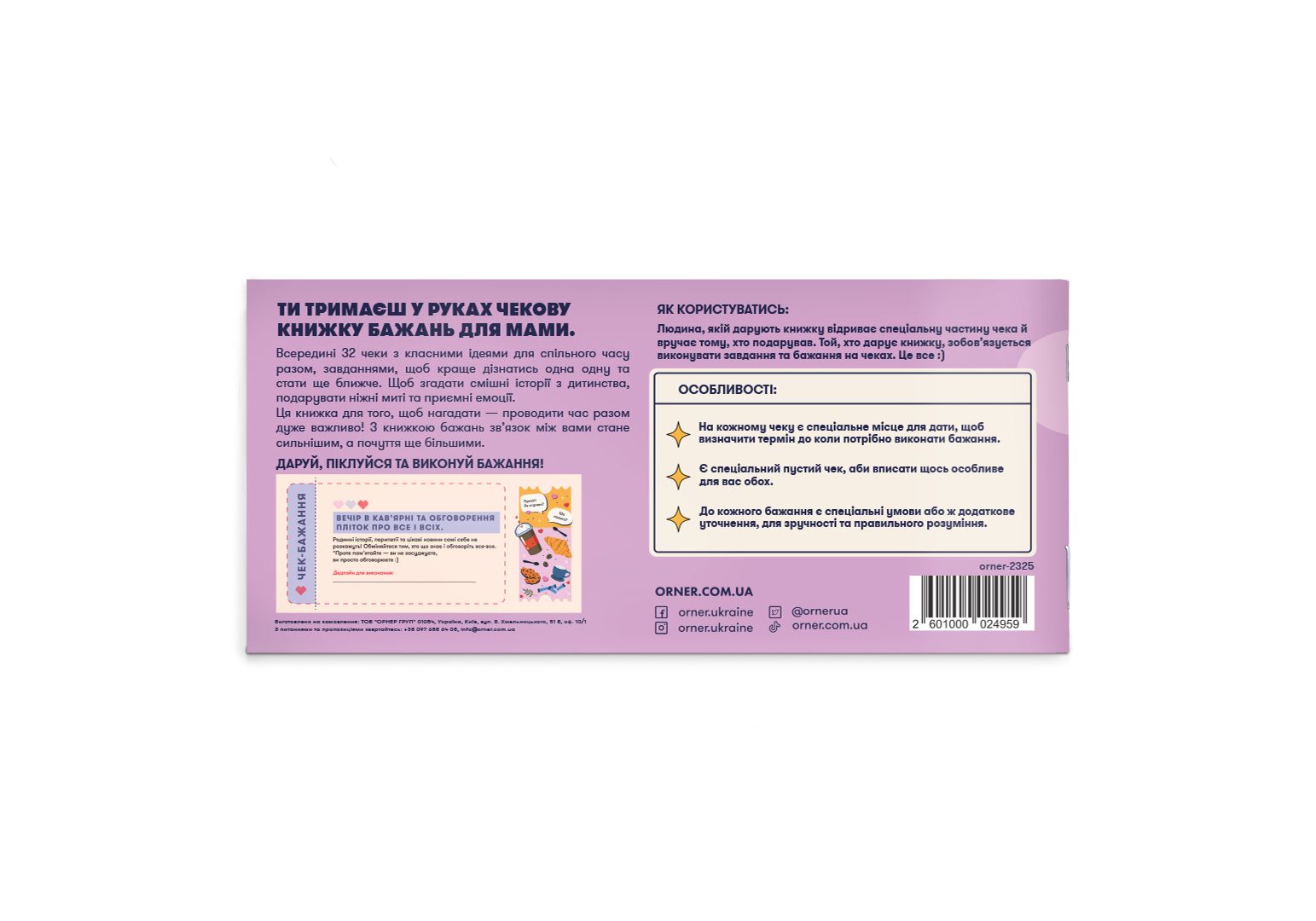 Чекова книжка бажань «Для мами» — 32 чеки на завдання, щоб ви класно провели час разом! Вона про моменти, які стануть початком вашого найтеплішого періоду відносин та які ви обов'язково захочете повторити. Навіть найкращі відносини з мамою іноді потребують нагадування того, які ви важливі одна для одної. Саме для цього ми і створили чекову книжку бажань «Для мами» — щоби ви отримали незабутній досвід разом та вивели вашу дружбу на новий рівень.