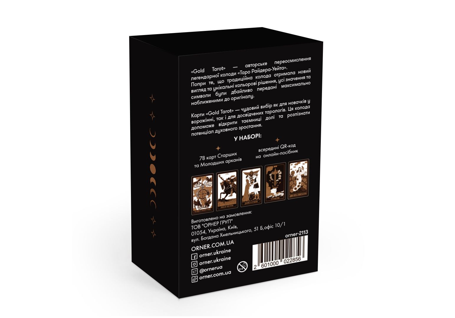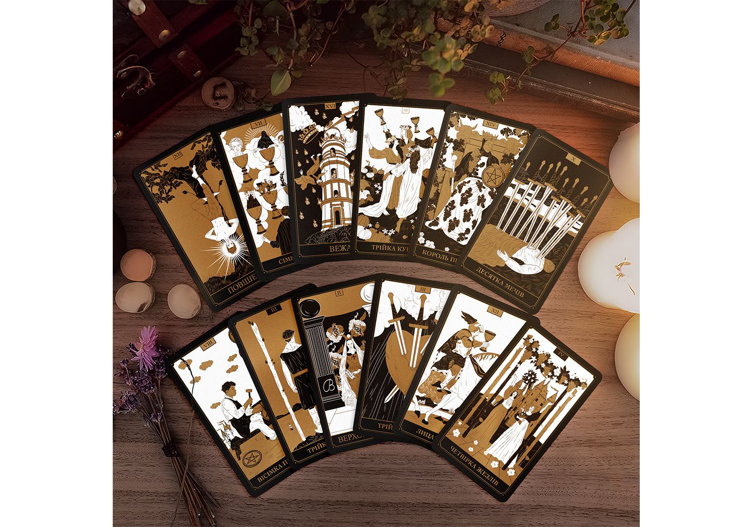 «Золота колода» — авторське переосмислення класичної колоди із стильними кольоровими рішеннями та неймовірною символікою. Те, що треба, щоб насолодитися ворожінням на повну. «Золота колода» — про ворожіння із особливим вайбом. Вона виконана у чорно-золотих тонах, проте її символічна основа збережена максимально наближеною до оригінала. Ця колода — не тільки інструмент для ворожіння, а й путівник у світ таємниць, що живуть всередині та навколо нас. Вона запрошує в подорож у глибину пізнання та допомагає розгадувати складні зав'язки долі й знаходити внутрішню гармонію.