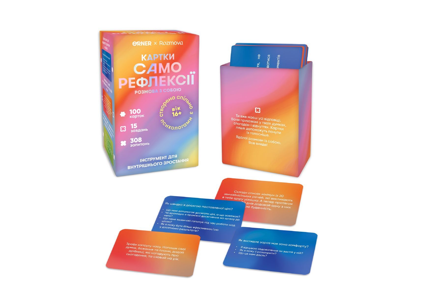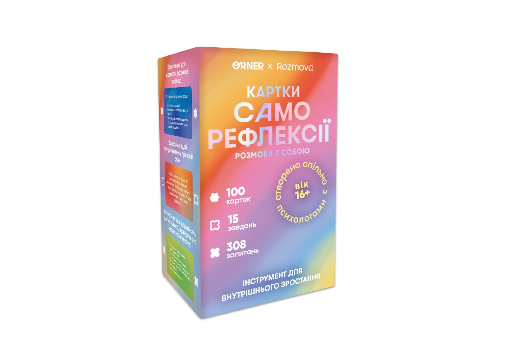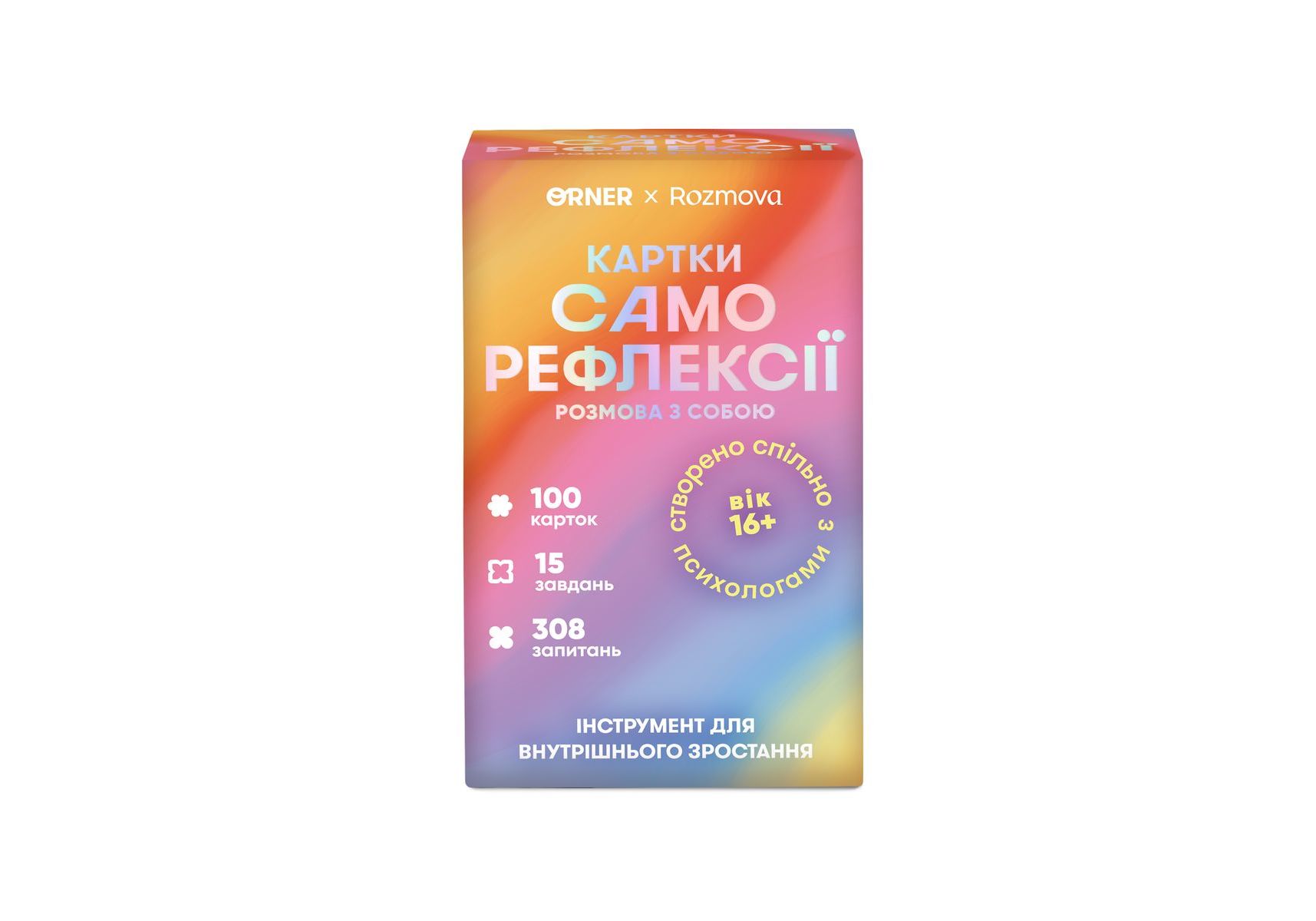 Карточки саморефлексії ORNER x Rozmova «Карточки саморефлексії: розмова з собою» — інструмент для пізнання себе, створений з психологом. Всередині питання для відвертої розмови з собою і про себе, а також завдання, які допоможуть попіклуватись про свій емоціний стан. Всередині на тебе чекають різні завдання, а також питання для себе і про себе, які допоможуть дізнатися більше. А найважливіше те, що вони не про контроль, вони про піклування. «Карточки саморефлексії: розмова з собою» — це психологічна гра, в якій ти тільки виграєш. Тому що починаєш помічати себе, свої почуття та потреби.