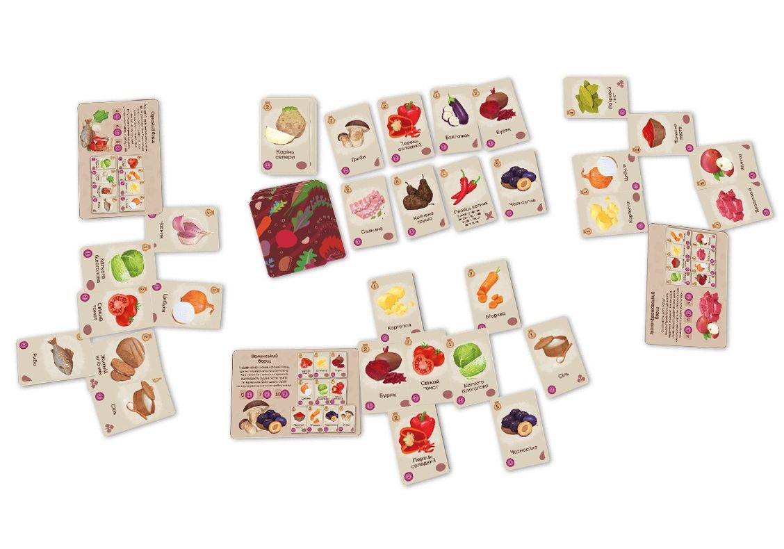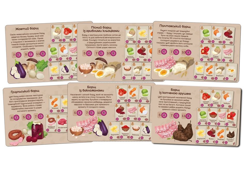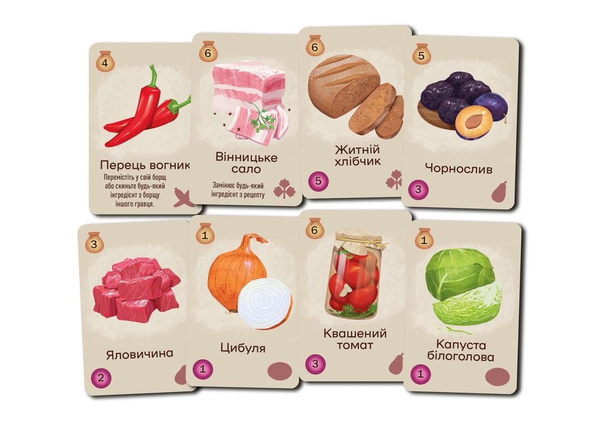 Чи знаєте ви рецепт справжнього українського борщу, того самого борщу, який визнано спадщиною ЮНЕСКО, який готує кожна хазяйка та хазяїн, рецепт якого передається з покоління у покоління? Точно знаєте! Але можемо побитися об заклад, що він відрізняється від рецептів, які знають ваші друзі, адже у кожному регіоні, кожному місті та кожній сім’ї борщ готують по-своєму. Незмінним є лише один інгредієнт – любов! Борщ це етнічна гра української розробки для всієї сім’ї, у якій аж до 7 гравців будуть готувати свій фірмовий борщ! Комбінуйте картки інгредієнтів, додавайте сметанку та зелень та бережіться від шкварок під час куховаріння! Для «саме того» борщу потрібні дуже незвичні інгредієнти! На початку партії кожний гравець повинен обрати свій борщ: це може бути страва з грушами, квасолею, або навіть рибою! Але якщо картоплю знайти досить просто, та й коштує вона не багато, то чорнослив на ринку ще треба пошукати. Саме тому у свій хід ви можете поміняти кілька будь-яких продуктів з руки на один більш дорогий з ринку, кілька дешевих з ринку на один дорогий власний, або просто добрати карти з колоди. І звичайно, основна дія у грі – приготування борщу! Вам необхідно викласти всі інгредієнти, вказані у вашому рецепті, додати по смаку сметану та кріп, а може ще й використати перчинку, аби зробити пікантнішою страву конкурентів. Настав час для шкварок! Кожна партія буде супроводжуватися випадковими шкварками, які може дістати з колоди будь-хто, але ефект їх спрацює на всіх. Це може бути одноразовий або постійний ефект, що урізноманітнює гру та додає нових смаків у партію!