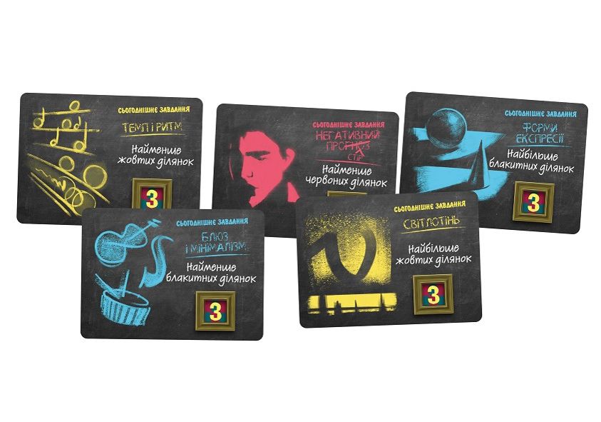 Приготуйтеся приміряти на себе образ студента художньої академії. Вам доведеться створювати абстрактні картини, сплітаючи між собою хитромудрі візерунки і наділяючи їх сенсом. Учасники Abstract Academy мають змагатися в креативі та творчих уміннях, оскільки лише кращі роботи здобудуть найвищі оцінки. Академія мистецтв (Abstract Academy) – стратегічна гра, для якої знадобиться натхнення. Доведеться також проявляти пильність, оскільки підступні опоненти заздрять вашому успіху і можуть спробувати зіпсувати полотно. Творіть абстракції, вражайте професорів та збирайте переможні очки, вписуючи своє ім’я в історію мистецтв. Пориньте у світ абстракції Гра розрахована на 2-4 особи, а одна партія може займати до 40 хвилин. На першому етапі потрібно відсортувати карти залежно від кольору сорочки, а потім роздати кожному з учасників по три карти полотна та одну карту натхнення. У того, хто ходить першим, буде знаходитись карта улюбленця, яка допомагатиме вирішувати неоднозначні моменти. Ігровий процес в Академії мистецтв поділено на три раунди: Теорія кольору – з кожної колоди кольорових завдань викладається по одній карті обличчям догори. Композиція – викладаються дві випадкові карти Професора. Фінальний проект – потрібно взяти карту Професора та дві випадкові карти кольорових завдань. Ходять гравці по черзі. Під час своєї черги потрібно розмістити картку полотна на полі та взяти додаткову картку полотна. На початку партії загальне поле може не мати конкретної форми, але обмежено форматом 4?4 чи 5?5 залежно від кількості учасників. Розміщувати карти можна лише по краях ряду. Потрібно заволодіти картами завдань, оскільки це допоможе визначити переможців. У випадку нічиєї карта улюбленця дозволить вирішити суперечку, інакше доведеться скинути завдання. Вибір найкращого художника Після трьох раундів іде підрахунок переможних очок. У процесі враховуються карти завдань та натхнення. Останні розігруються наприкінці раунду. Переможні очки приносить і карта Професора.