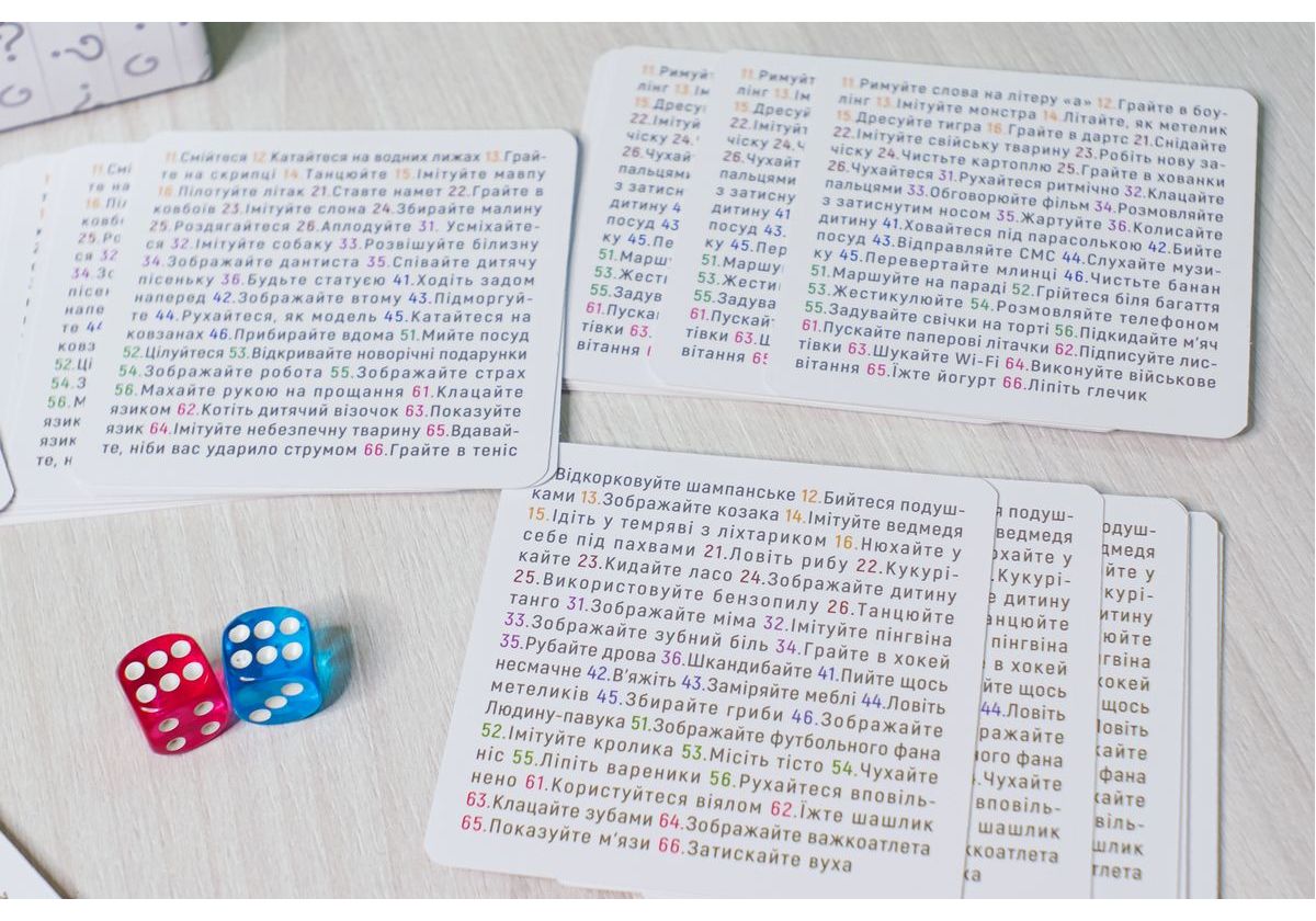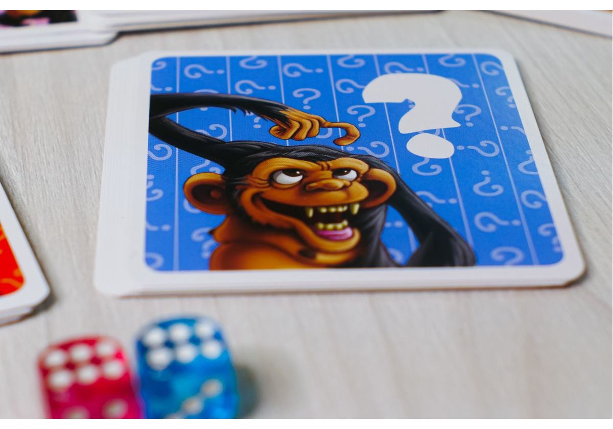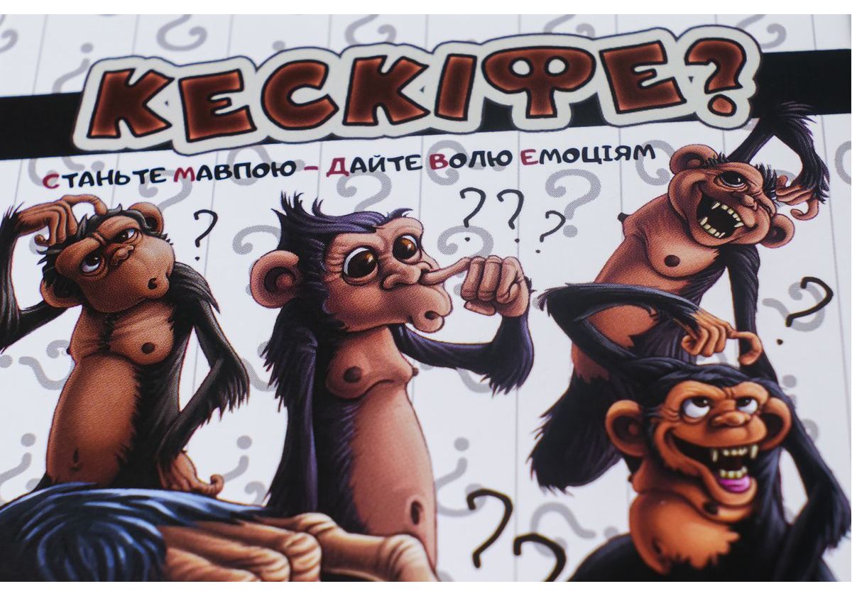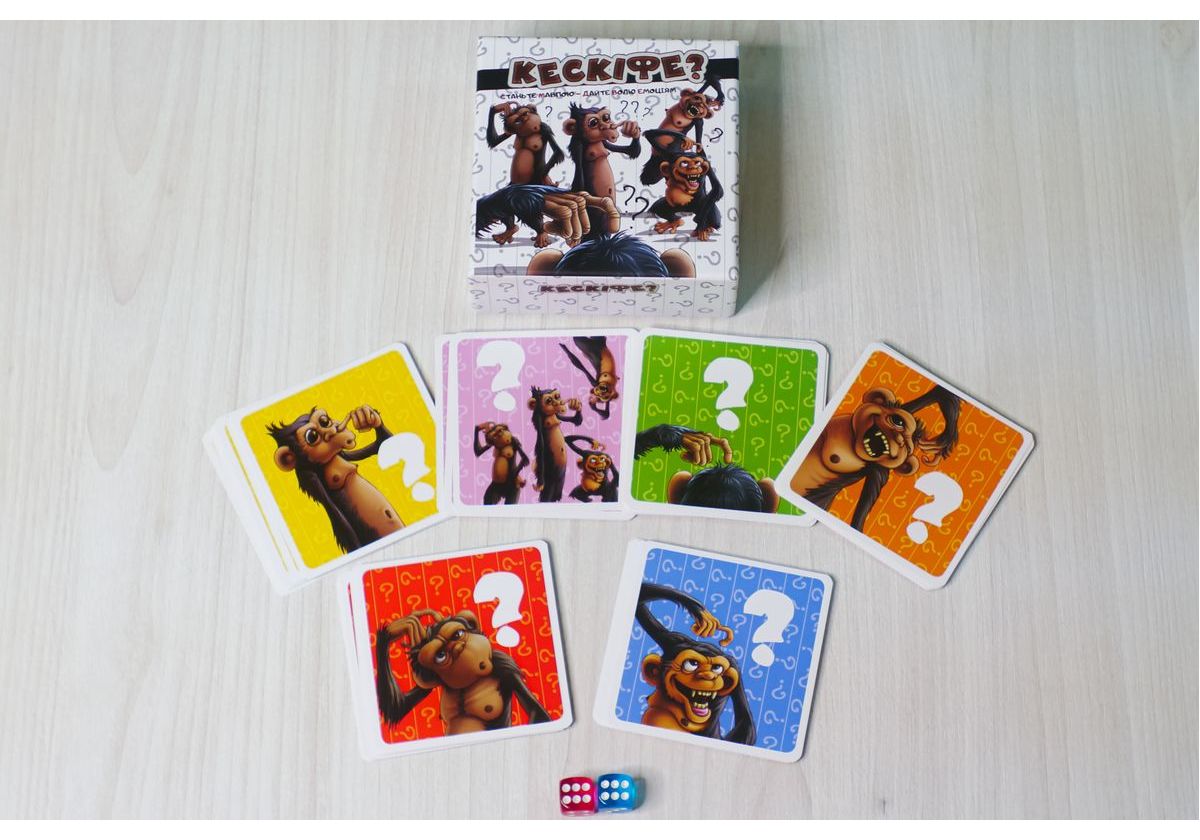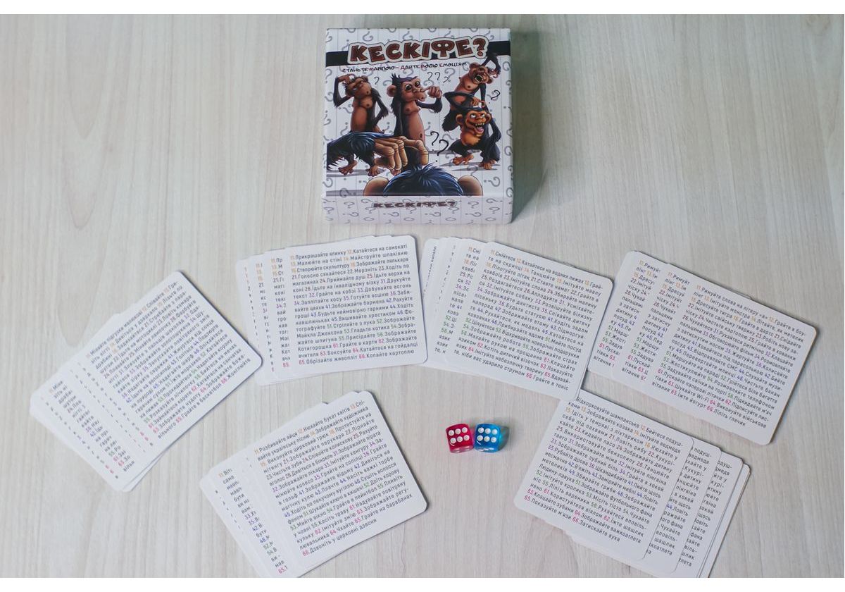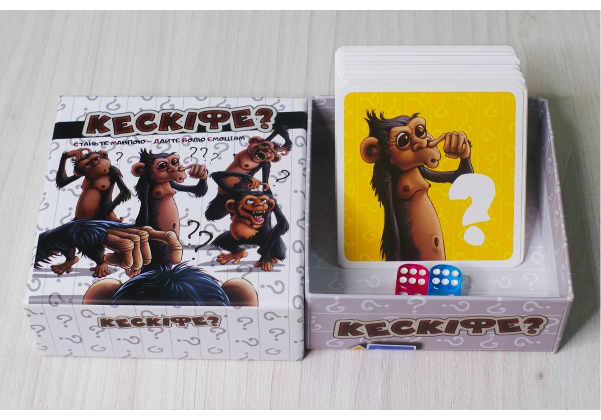 «Кескіфе» із французької «Qu’est-ce qu’il fait?» означає «Що він робить?». Цього, в принципі, вже достатньо, щоби зрозуміти, що однойменна гра буде дуже веселою. Правила тут такі, що не займають багато часу для вивчення. Більше того ? поріг входження дуже низький, тож узяти участь зможуть гравці майже будь-якого віку. То що це за гра така? Усього буде 6 раундів. Ведучий (якого ви всі обрали) бере одну з колод на свій вибір і за 3 секунди вирішує, чи він візьме собі картку «Ви мавпа», чи звичайну із текстом. Усі інші потрібно перетасувати між собою та роздати гравцям. І тут у дію вступають ігрові компоненти, про які ми ще не згадували ? синій і червоний кубики. Після того, як усі картки будуть роздані, потрібно їх кинути, аби визначити, яка ж саме буде пантоміма на цей раунд. Синій кубик відповідає за десятки, а червоний ? за одиниці. Дивимось, що написано на картці під цим номером, і на рахунок «три» починаємо виконувати! Все максимально просто! Проблеми можуть виникнути в тих чи в того, хто отримав картку «Ви - мавпа». На ній цей текст повторюється купу разів, у той час, як на інших зустрічаються різноманітні дії. Як стає зрозумілим, власник цієї картки поняття не має, яку дію потрібно виконувати. І в той час, поки всі починають заколисувати дитину чи марширувати, потрібно дуже швидко адаптуватися та повторювати ці рухи за ними, допоки ніхто не встиг запідозрити мавпу! Якщо подивитися на все це збоку, то це виглядає як якесь безумство, але дуже веселе безумство! Після подібних розваг завжди є що згадати, а ще це дарує море позитиву. Коли всі завершать показувати свою маленьку виставу, настане час визначати мавпячого шпигуна. Тут усе просто ? учасники одночасно мають вказати на того, хто здався їм найбільш підозрілим. Хто розпізнав мавпу, забирає свою картку до колекції як переможне очко. У кого ж це не вийшло, повинні покласти свої картки в центр столу. Виграла мавпочка? Вона забирає собі половину карток, а якщо їх було двоє, то ділять порівну. Можна переходити до наступного раунду, для якого потрібно обрати нового ведучого. Нехай максимальна кількість гравців спробує цю роль на собі. Як нескладно здогадатися, переможе той із вас, хто матиме наприкінці партії більше всього карток. Любителі мавп, відгукніться! Знаєте, а Кескіфе (Keskife) ? це справді весела й запальна настільна гра, яка зробить багато корисних речей для вашої вечірки. По-перше, вона вас усіх розважає, адже тут не потрібно докладати величезних розумових зусиль, напружуватися. По-друге, спогади від партії однозначно залишаться на довгі роки, так само, як і контент для ваших соцмереж. Під час наступної зустрічі хтось обов'язково розповість, як ви вдавали макаку! Ну а по-третє, гра й справді дозволяє вам повеселитися та відчути себе безтурботно, хоч на цей невеличкий час. А якщо не можете спинитися і бажаєте продовжити задоволення, то просто зіграйте ще декілька партій підряд!