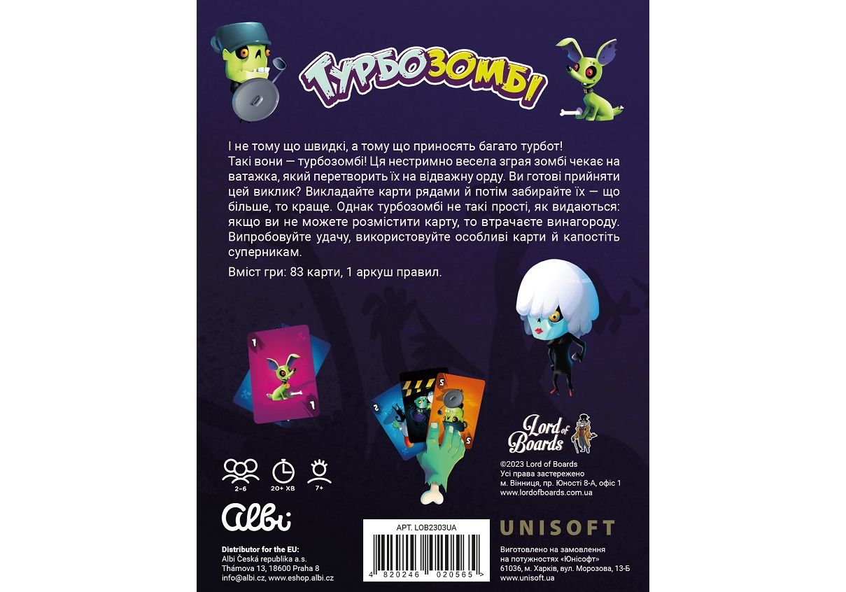 Зазвичай в іграх про зомбі мета полягає в тому, щоб знищити якомога більше нежиті, яка раз у раз намагається з'їсти всіх навколо або перетворити їх на таких же дурних монстрів. Однак учасники Турбозомбі (Troublez) мають створити власну потужну армію, здатну стати надійною ударною силою. Для цього доведеться ризикувати, прораховувати ходи опонентів і діяти грамотно, продумуючи дії наперед. Усе контролювати не вийде, іноді потрібно просто довіритися волі випадку. Участь у картковій настільній грі можуть брати від 2 до 6 осіб, тому вона відмінно підійде для компаній. Хоча все обертається навколо теми зомбі, сам ігровий процес і ілюстрації залишають місце для веселощів та добродушного протистояння. Беріть у руки колоду і починайте створення власної орди! Створіть власну армію зомбі Турбозомбі (Troublez) – максимально проста гра з мінімальним набором правил, з якими легко розібратися прямо у процесі. Одна партія може займати в середньому 20-30 хвилин, вона буде пронизана азартом, удачею та духом суперництва. Учасники мають брати карти з колоди, збираючи ряди з п’яти або набори з чотирьох карт. Під час свого ходу необхідно перевертати карти по одній в одному із трьох рядів. До того ж існують певні вимоги щодо кількості та кольору поруч лежачих карт. Після успішного розіграшу карти на столі є можливість вирішити: зупинитися і зібрати всі карти з ряду на вибір або випробувати удачу і перевернути іншу карту. Результат такого ризику непередбачуваний, можна або отримати несподівану вигоду, або залишитися ні з чим. Колода складається із зомбі трьох кольорів, карти оригінально проілюстровані та задають особливу атмосферу. Крім основних ігрових, передбачені карти з особливими здібностями, у тому числі: - Сітка – з її допомогою гравець може вкрасти карту зомбі у свого опонента. - Дробовик – дозволяє скинути деяких зомбі, якими володіють інші учасники. - Сокира – змушує гравця скинути одну з наявних у нього карт. Розпоряджатися картами краще обережно. Учасники ходять по черзі, маючи нагоду брати карти зі столу. Корисно стежити за маневрами суперників та не залишати їм корисні карти. За грамотного підходу можна суттєво зіпсувати життя іншим творцям власної армії зомбі. Чия армія більш потужна? Завершення настільної гри багато в чому залежатиме від стратегії, але ще більше від удачі. Щоб зібрати власну орду, учаснику необхідно мати певний набір карток. Це можуть бути чотири карти з одним номером, тобто однаковими монстрами, або п’ять карт із номерами по порядку від 1 до 5. Перемога наприкінці партії за тим, кому вдалося зібрати найсильнішу армію нежиті. Турбозомбі (Troublez) відмінно підійде для шанувальників зомбі-тематики та простих карткових ігор з нехитрими правилами. Ви можете влаштовувати дуельні битви або грати великою компанією, весело проводячи час разом із сім'єю та друзями. Ходи переходять від гравця до гравця, тому партії розвиваються динамічно та не займають багато часу.