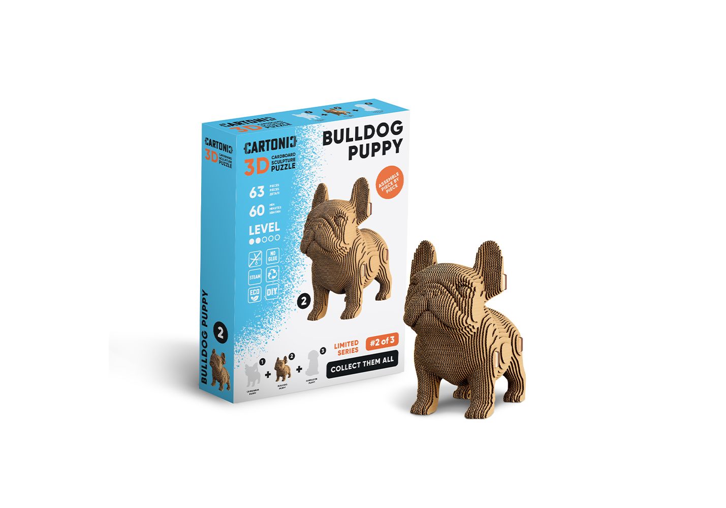 BULLDOG PUPPY — милий цуцик із набору PUPPIES TRIO. Лабрадор-ретривер, французький бульдог і чіхуахуа — такі різні, але кожен із них чарівний по-своєму. Збери цих пухнастих друзів своїми руками, розфарбуй улюбленими кольорами або залиш у стильному крафті. 3D-пазл неодмінно стане яскравим акцентом у твоєму просторі й подарує радість любителям собак!