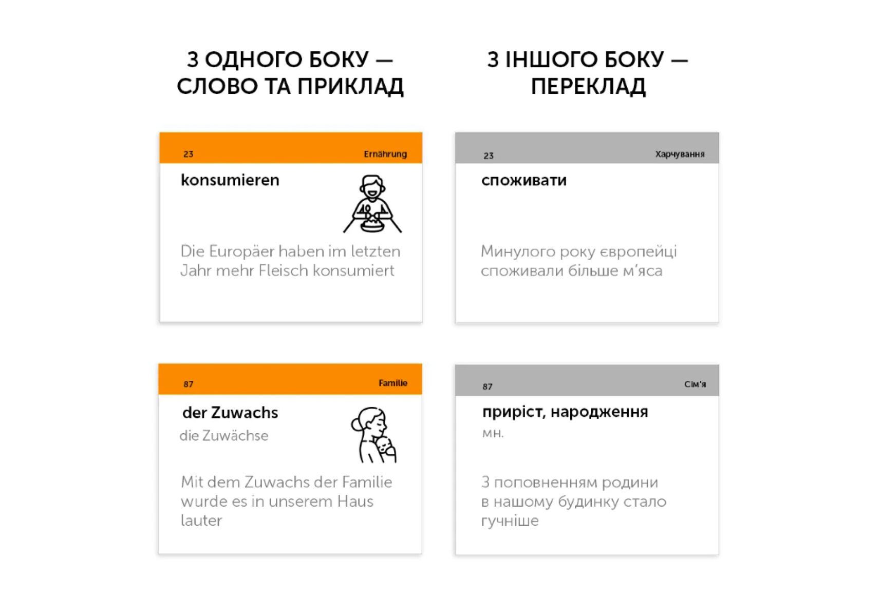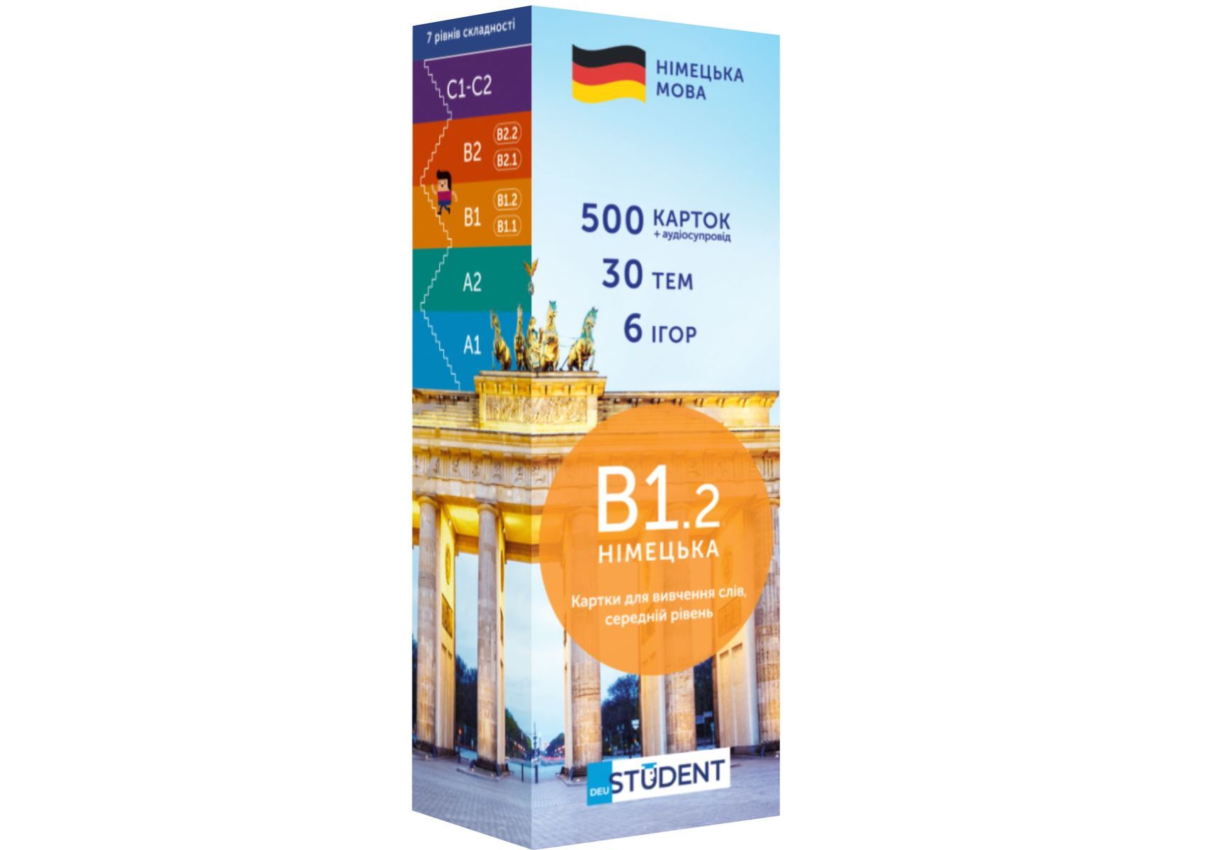Набір німецька В1.2 — друга частина середнього рівня. Призначена для тих, хто вже опанував базові рівні та хоче почати розуміти інших, дивитись фільми й читати нескладні тексти німецькою. Картки цього рівня допоможуть опанувати базову розмовну лексику.