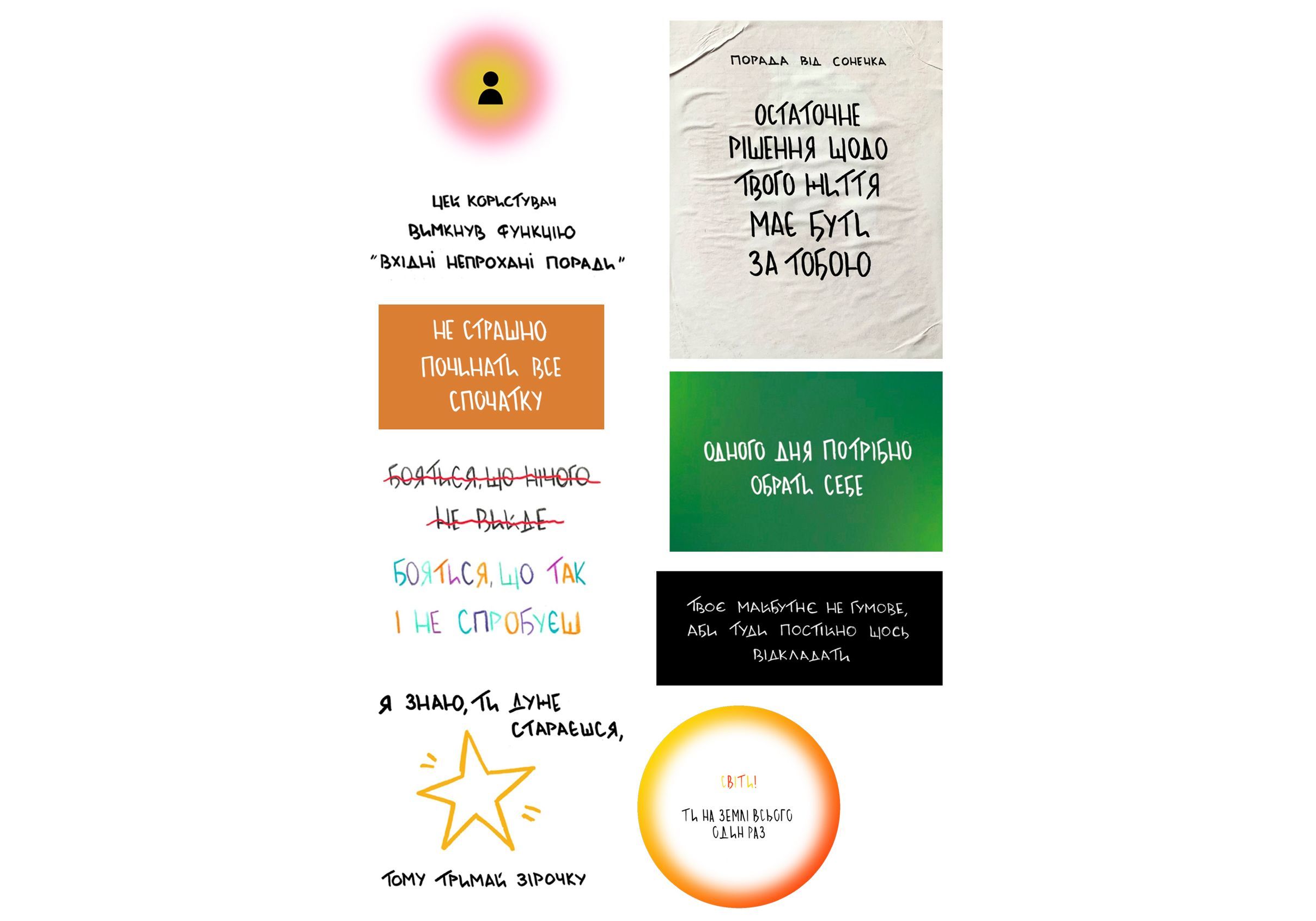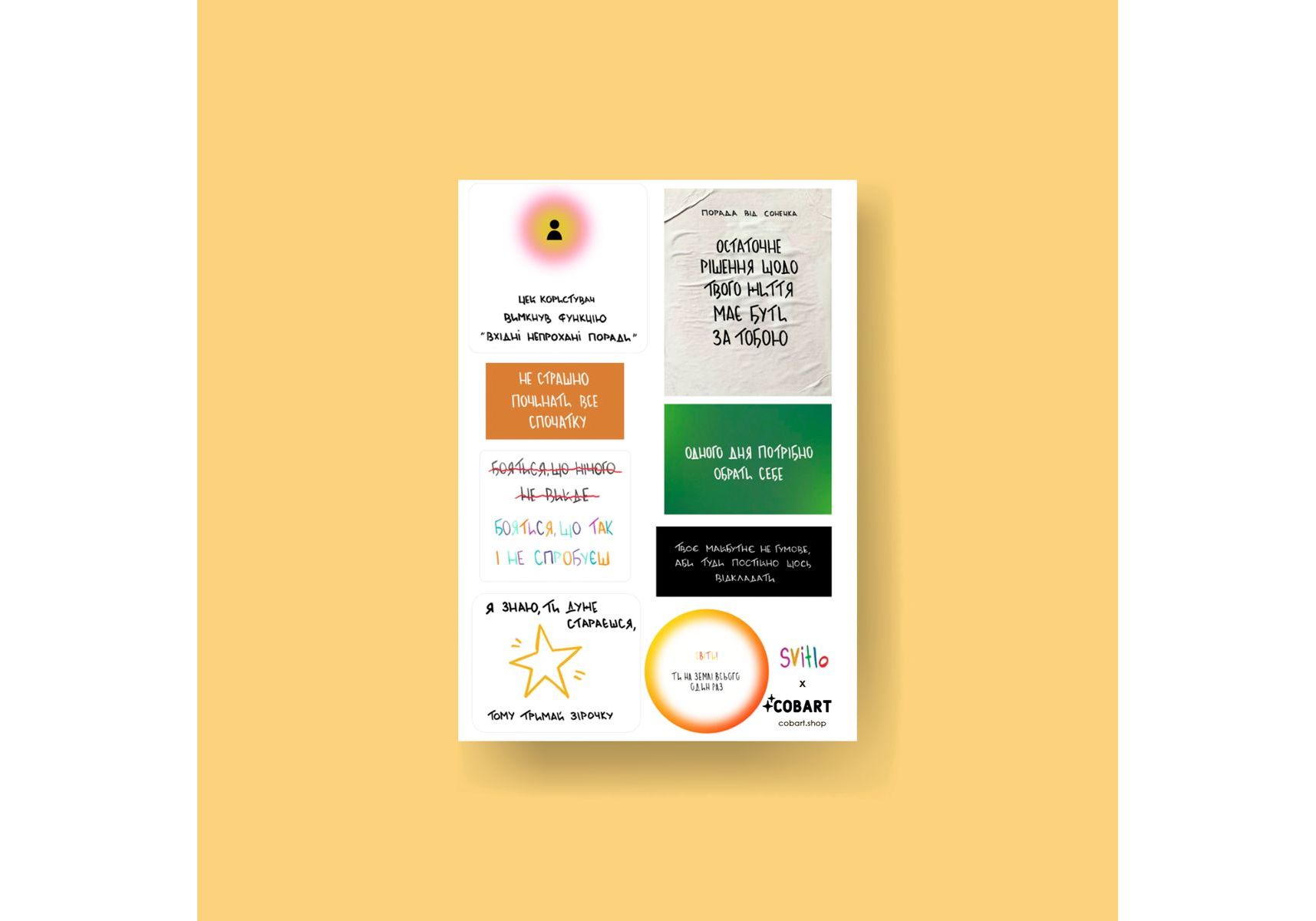 Мы со Svitlo.mgz объединились и создали стикеры, которые будут напоминать вам о важных вещах в эти теплые дни?? Cтикеры формата А6, устойчивые к износу, не повредят ваши гаджеты и блокноты. Небольшие по размеру, но большие по содержанию – это наши мотивирующие стикеры формата А6 с важными напоминаниями. Эти стикеры станут вашими верными спутниками на пути достижения целей и поддержки себя. Они идеально подходят для размещения в блокноте, планере или вашем рабочем пространстве. Каждый стикер поражает своей простотой и мощным напоминанием о ваших целях и возможностях. Добивайтесь больших вещей с нашими мотивирующими стикерами А6 – вашими небольшими, но мощными помощниками на пути к успеху