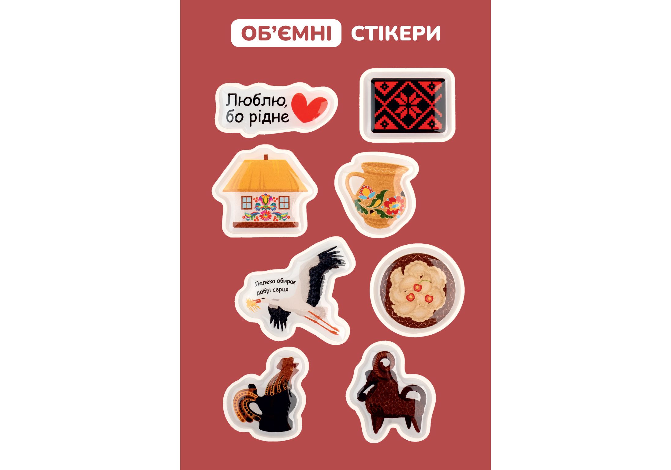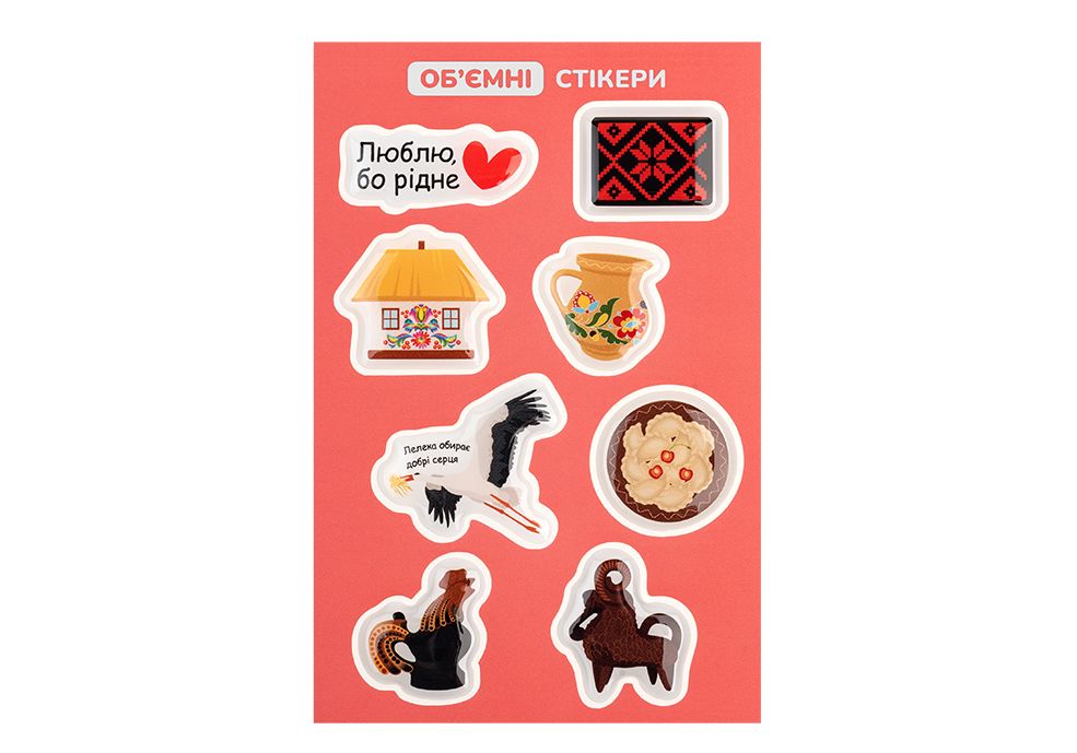 Стікерпак «Етно» — набір об’ємних наліпок з українським характером. У ньому — хатинка, півник, глечик, лелека, червона вишиванка, вареники, баранчик та напис «Люблю, бо рідне». Ідеально тримаються на мобільних телефонах, ноутбуках, дзеркалах і блокнотах. Зносостійкі та яскраві.