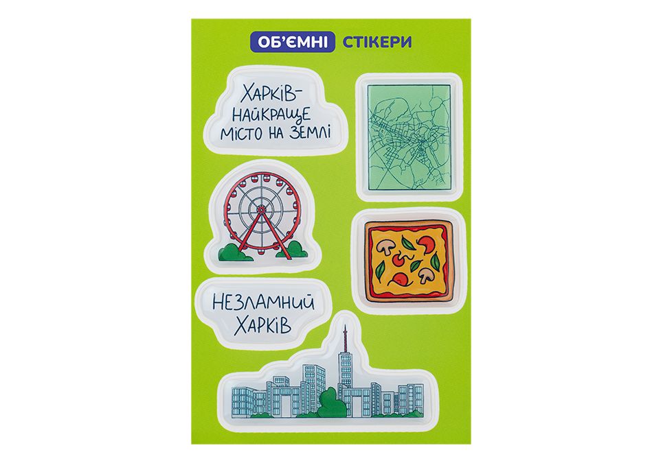 Об’ємний стікерпак «Харків» - це п’ять стильних наклейок, які передають атмосферу та унікальність міста: від панорами та відомого колеса огляду до шматочка піци й теплих фраз про любов і незламність Харкова. Ідеальний подарунок для тих, хто цінує своє місто, або як пам’ятний сувенір. Стікер має рельєфну текстуру, виготовлений із зносостійкого матеріалу, не тьмяніє з часом і гарно тримається на будь-яких гладких поверхнях - від мобільних телефонів і ноутбуків до дзеркал і блокнотів.