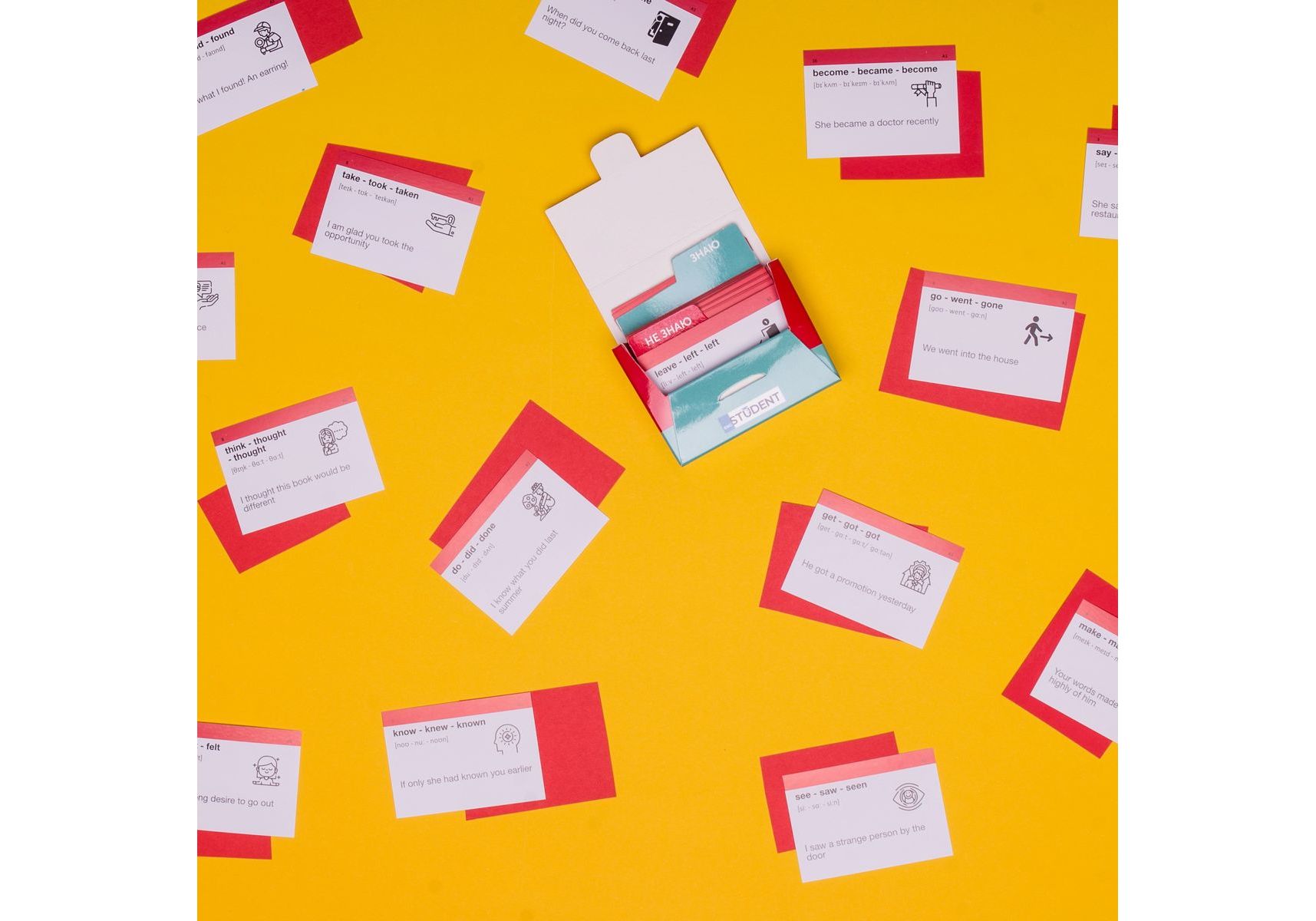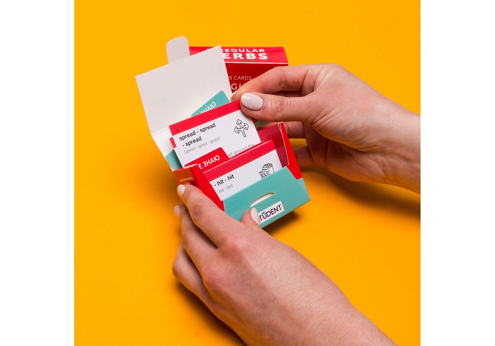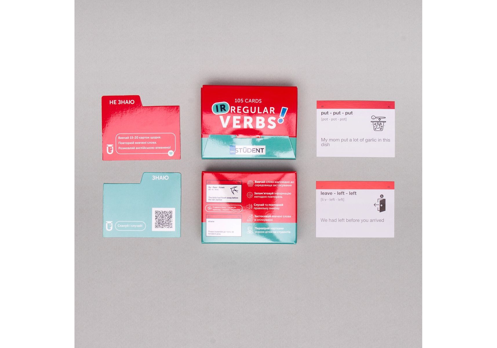 Irregular Verbs Набір «Irregular Verbs» — це добірка найвживаніших неправильних дієслів в англійській мові. Неправильні дієслова — це одна з основних граматичних тем, опанувати яку ну просто необхідно. Картки допоможуть правильно будувати речення в минулих часах, а додатковий звуковий супровід до кожної картки навчить правильно вимовляти дієслова. Усі слова в наборі поділені за рівнями (від А1 до В2), а всередині кожного рівня — за частотою вживання. 5 причин обрати картки від English Student: Вивчай! Нові слова відповідно до свого рівня та середовища застосування Запам’ятовуй! 95% інформації методом інтервальних повторень Розвивай! Пам’ять за допомогою регулярного повторення Практикуй! Розмовну англійську під час гри в настільні ігри Перевіряй! Картками знання дітей або студентів До набору входить: 105 карток з англійськими словами та прикладами спрощена коробка для навчання методом інтервальних повторень розділювачі «Знаю», «Не знаю»