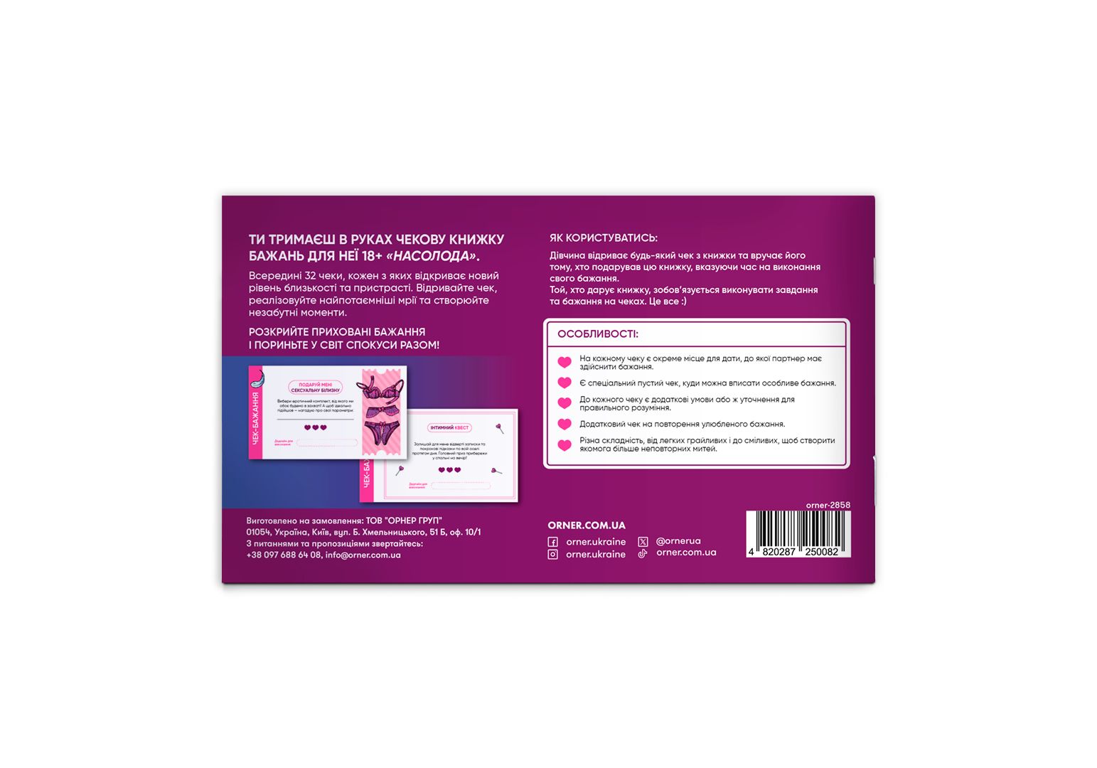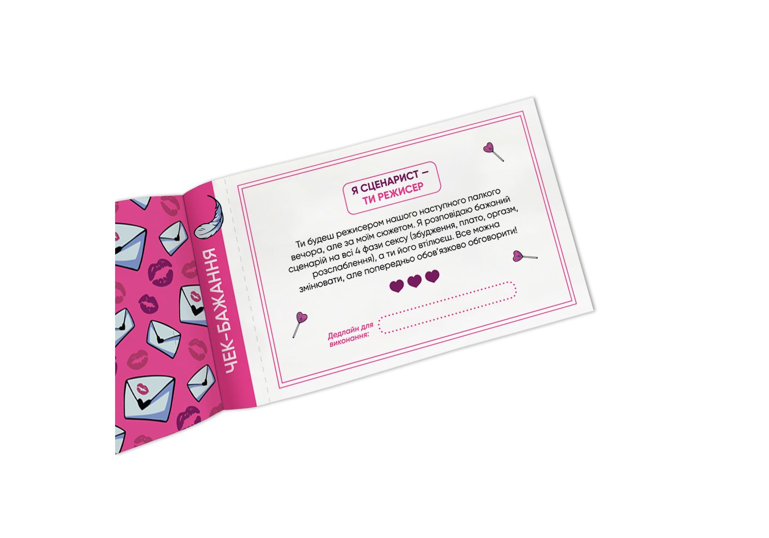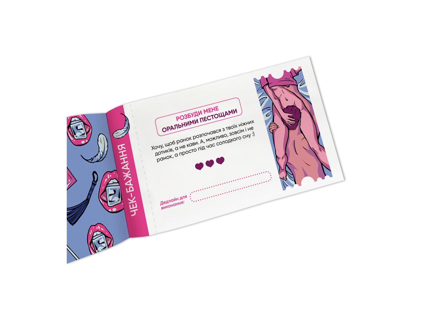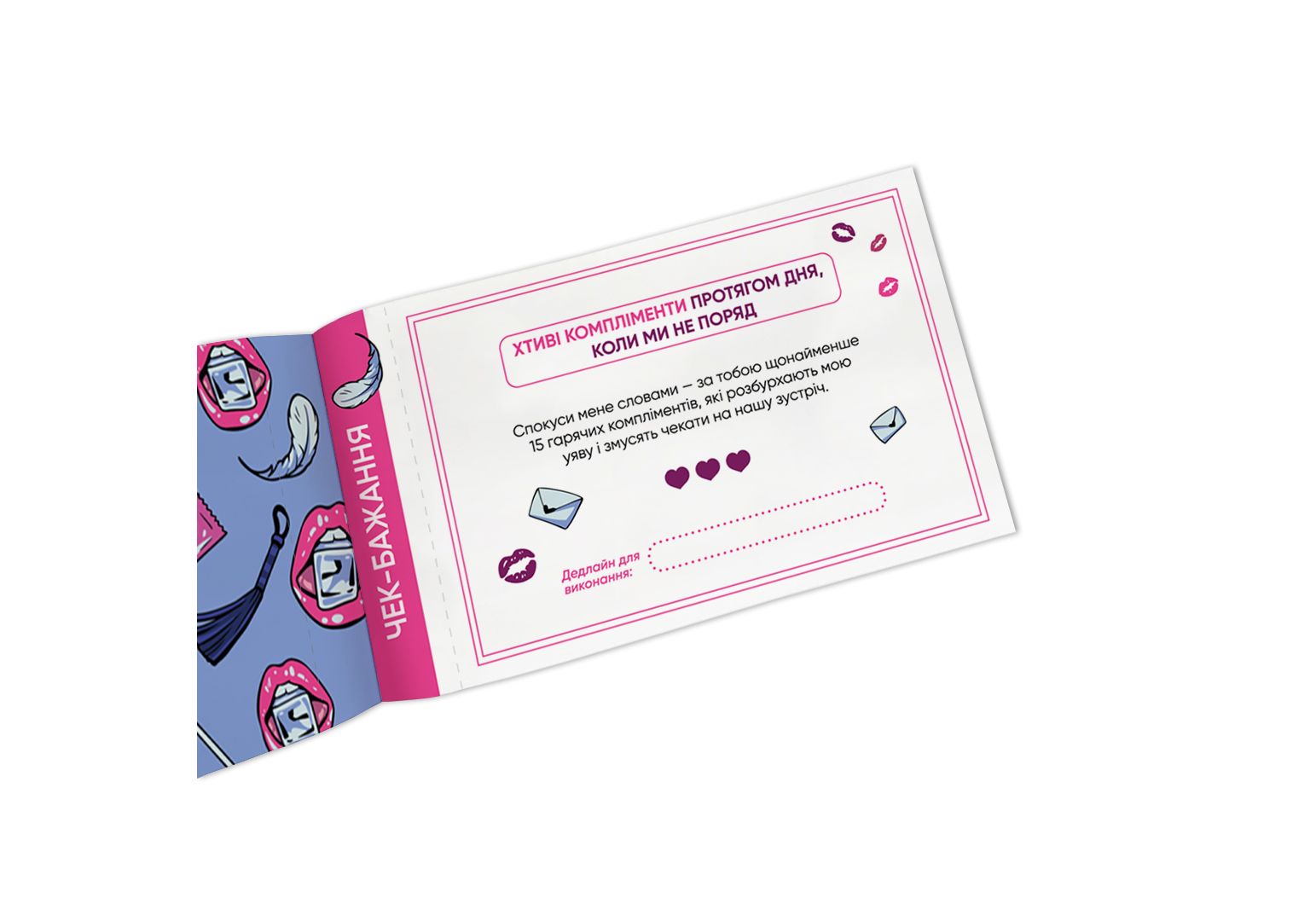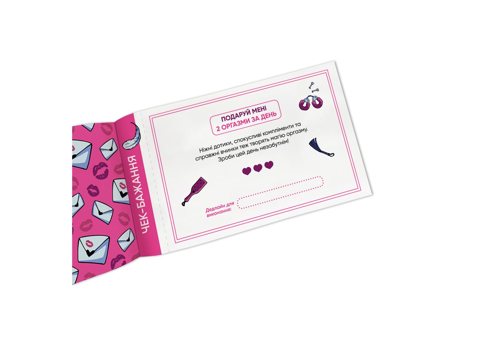 Чековая книга желаний для нее Наслаждение" - 32 чека на сексуальные задачи, которые подарят вашей половинке настоящее наслаждение! От игр по собственному сценарию до интимных квестов - эти чеки созданы, чтобы добавить в огонь вашей любви капельку горючего."