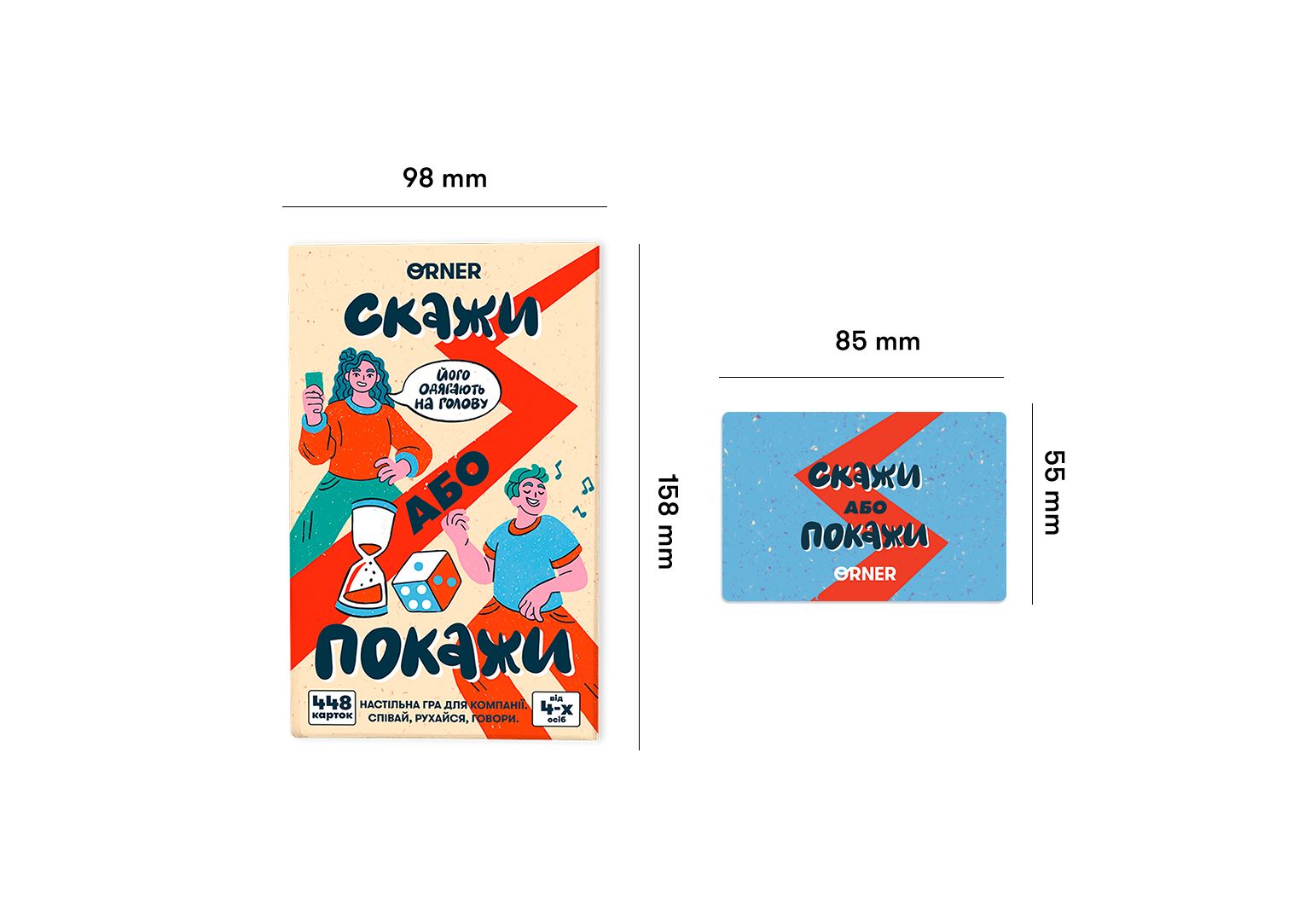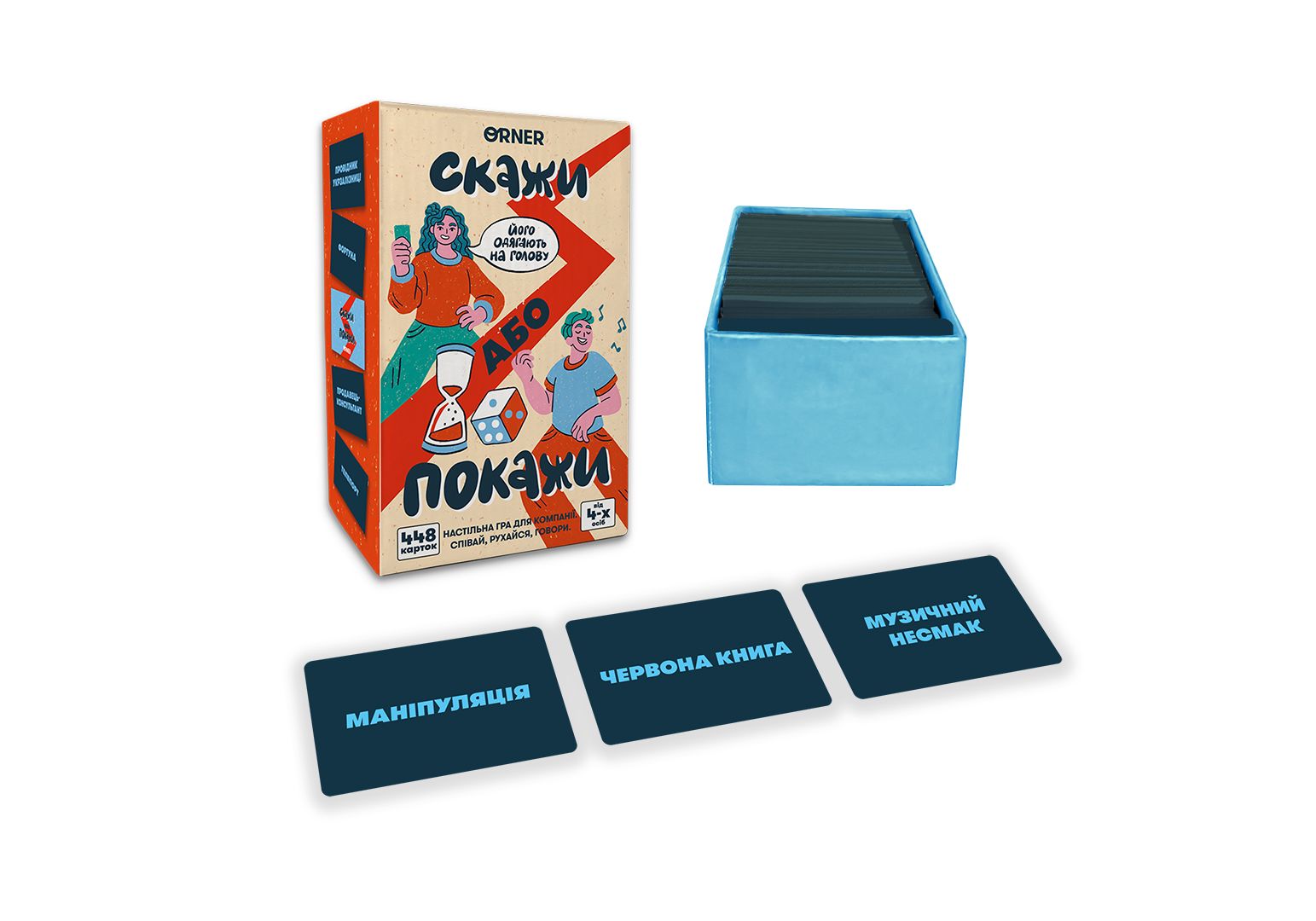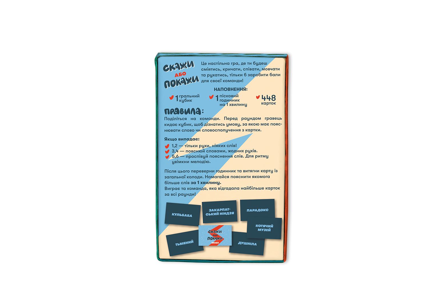 «Скажи или покажи» — наша новая игра для компании, где вы будете делать все, чтобы игрок вашей команды узнал, что (или кого) вы имеете в виду. Вернее, вы будете делать всякое разное: говорить, но не двигаться, или показывать и жестикулировать, но молчать. А может, споете объяснение слов? Сейчас разберемся вместе! Итак, правила! Поделитесь на команды. Перед раундом игрок бросает кубик, чтобы узнать условие, по которому должен объяснять слово или словосочетание с карты. Если выпадает: 1,2 – только движения, никаких слов! 3,4 — объяснять надо словами, никаких движений. 5,6 — спойте объяснение слов. Для ритма включите мелодию. После этого переверните часы и извлеките карту из общей колоды. Старайтесь объяснить как можно больше слов в течение 1 минуты. Выиграет та команда, которая отгадала больше всего карт за все раунды!