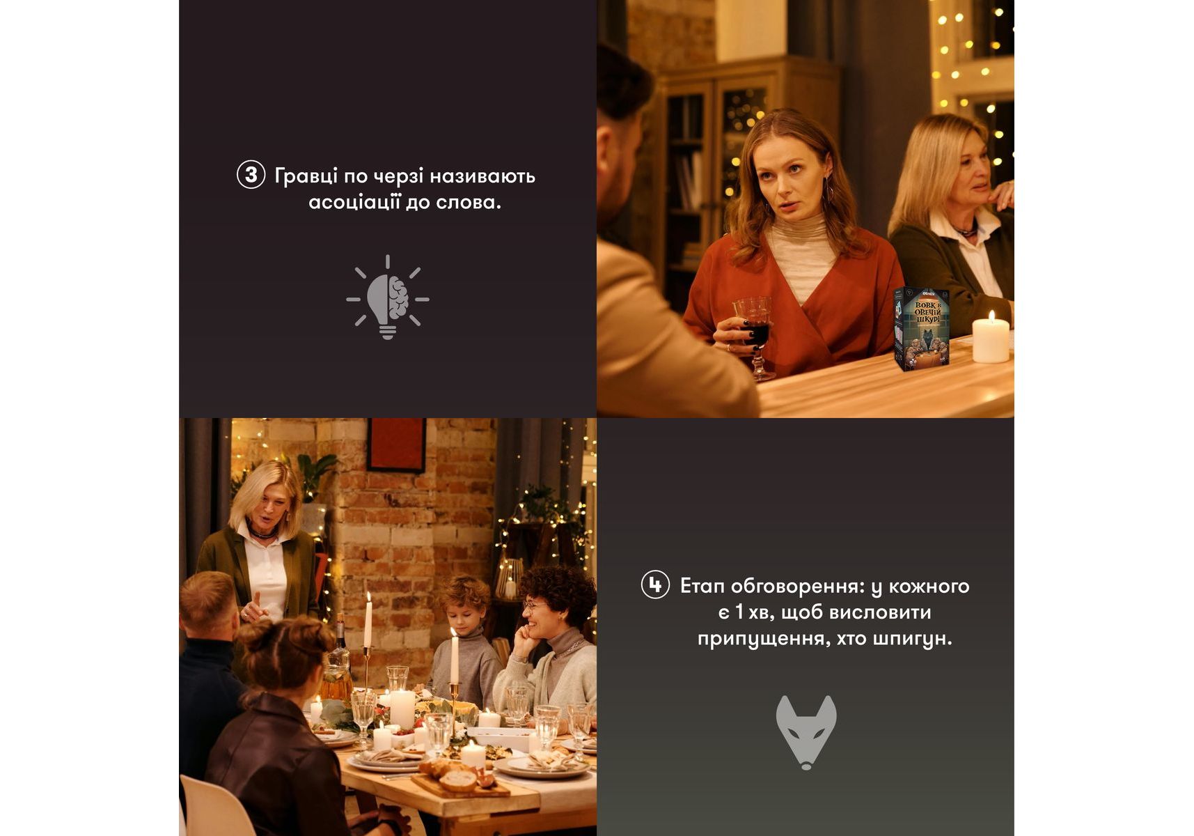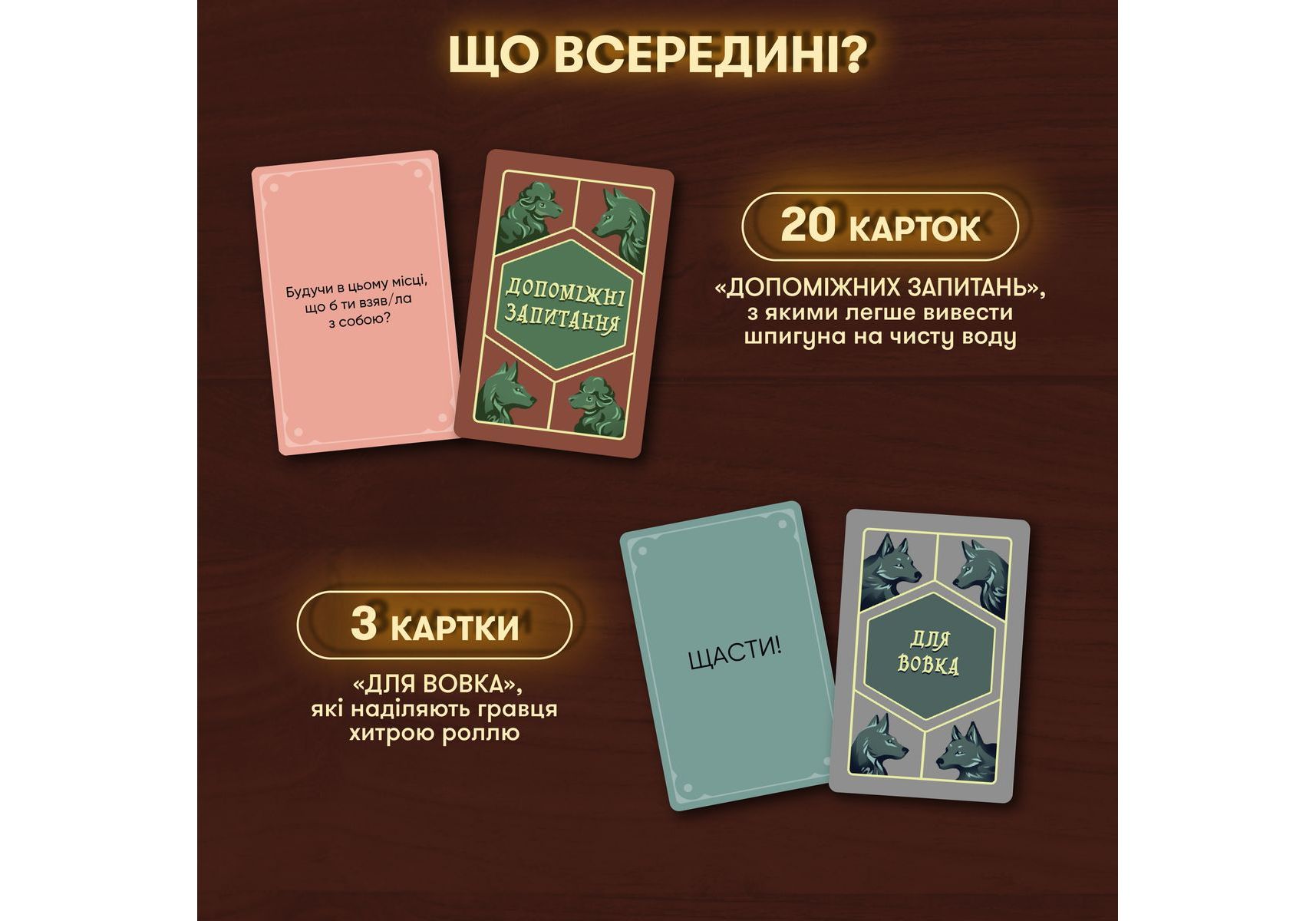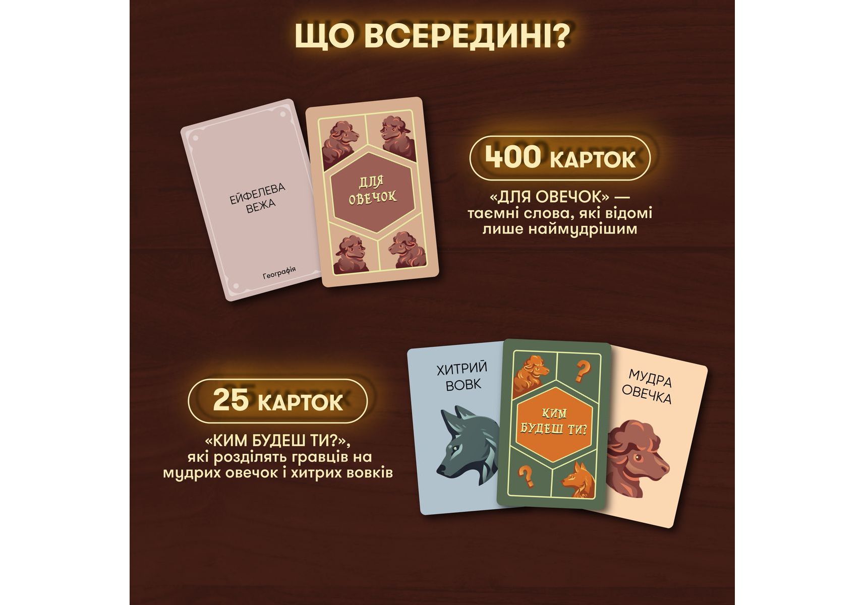 Стратегическая игра для компании «Волк в овечьей шкуре» — идеальная возможность испытать все актерское мастерство и проверить, как хорошо волку подходит овечья шкура, и насколько овцы внимательны, чтобы среди овечьих улыбок заметить волчий оскал. Собирайте друзей, ведь наша новая игра уже готова обеспечить вам леген… подождите-подождите… дарный вечер. Легендарный! «Волк в овечьей шкуре» — стратегическая игра для компании, наполненная секретами, расследованиями и подозрениями. Такими, чтобы каждый почувствовал себя героем лучших детективов. Правила игры: получив карту «Кем будешь ты?», каждый игрок узнает свою роль. Далее нужно будет взять карту из колоды и узнать секретное слово. Его будут знать все игроки, кроме волка. Путем ассоциаций и вопросов нужно будет разоблачить ложную овечку, но знайте, что волк тоже хочет одержать свою победу. Каждый раунд — это новый шанс победить! Покупайте игру и напрягайте все свои детективные навыки — кажется, среди ваших добрых друзей-овечек завелся хитрый волк!