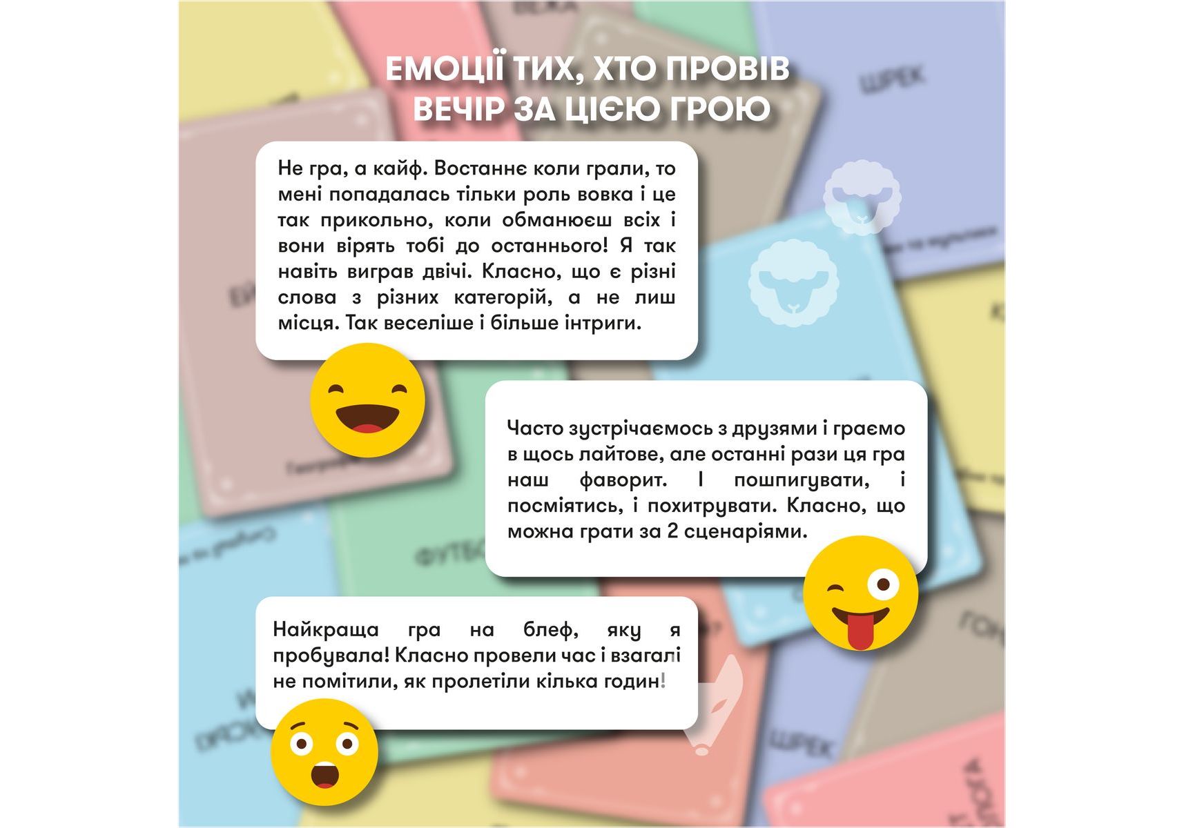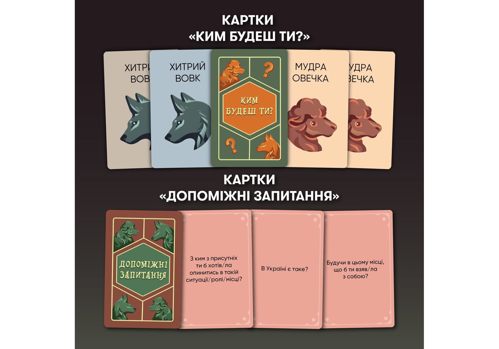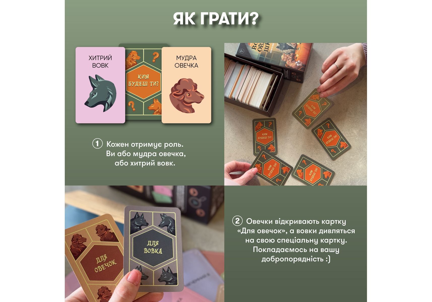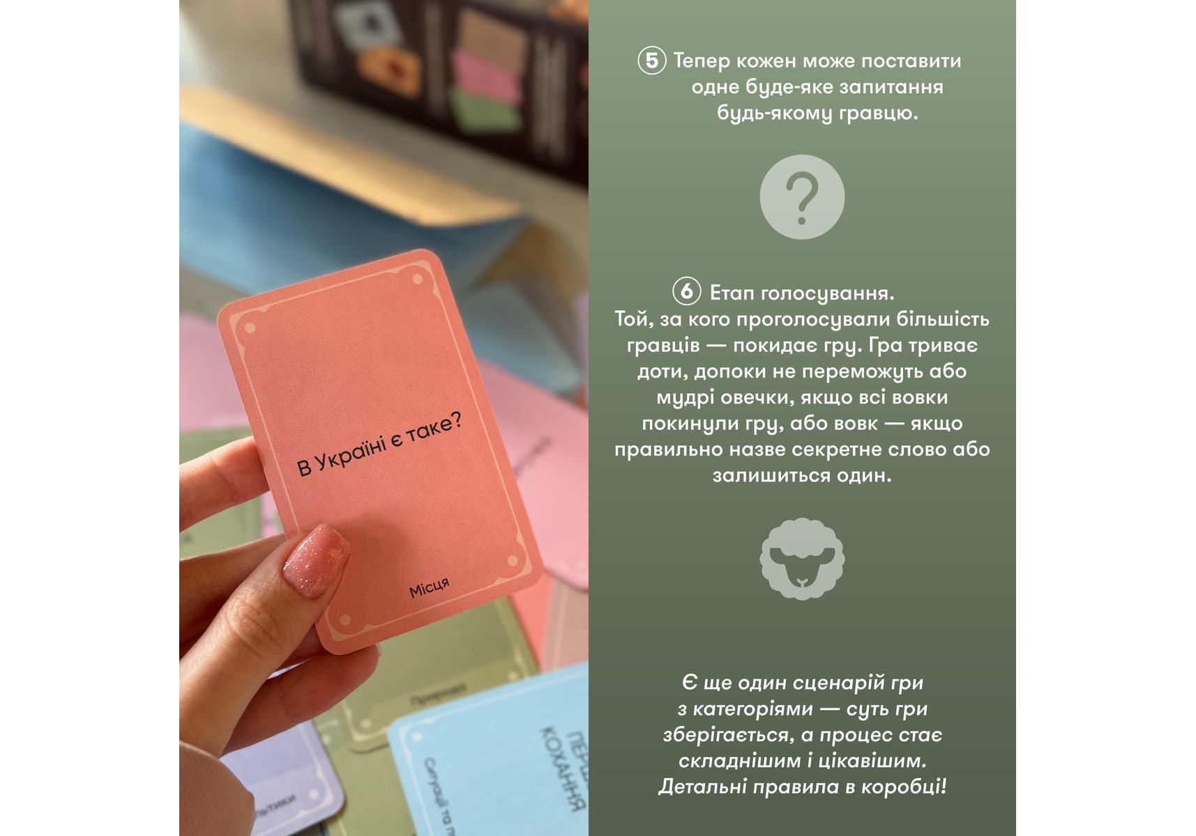 Стратегическая игра для компании «Волк в овечьей шкуре» — идеальная возможность испытать все актерское мастерство и проверить, как хорошо волку подходит овечья шкура, и насколько овцы внимательны, чтобы среди овечьих улыбок заметить волчий оскал. Собирайте друзей, ведь наша новая игра уже готова обеспечить вам леген… подождите-подождите… дарный вечер. Легендарный! «Волк в овечьей шкуре» — стратегическая игра для компании, наполненная секретами, расследованиями и подозрениями. Такими, чтобы каждый почувствовал себя героем лучших детективов. Правила игры: получив карту «Кем будешь ты?», каждый игрок узнает свою роль. Далее нужно будет взять карту из колоды и узнать секретное слово. Его будут знать все игроки, кроме волка. Путем ассоциаций и вопросов нужно будет разоблачить ложную овечку, но знайте, что волк тоже хочет одержать свою победу. Каждый раунд — это новый шанс победить! Покупайте игру и напрягайте все свои детективные навыки — кажется, среди ваших добрых друзей-овечек завелся хитрый волк!