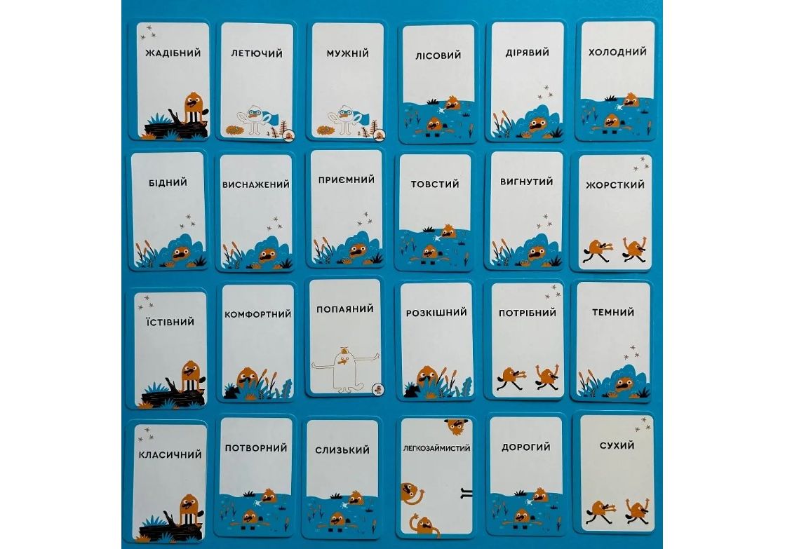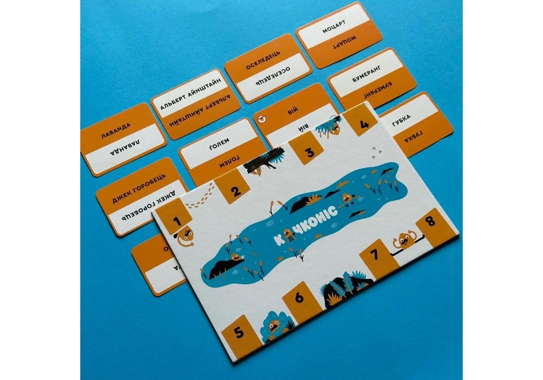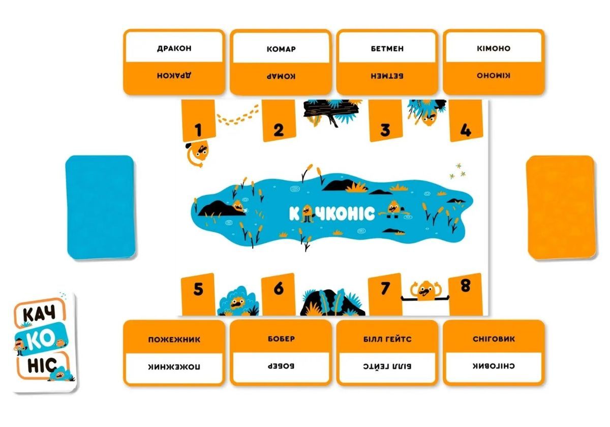 Качконіс (Platypus) — це кооперативна гра, у якіи? туристи намагаються знаи?ти загадании? іменник. У цьому і?м допомагатимуть провідники, використовуючи карти прикметників як підказки. Мета туристів — поступово відкидати іменники, що наи?менше відповідають підказкам провідників. Якщо наприкінці раунду загадании? іменник залишається єдиною видимою картою, то команда досягає успіху! Це відмінна настільна гра для вечірок і великих компаній, сімейних посиденьок, що однозначно подарує купу незабутніх емоцій. Учасників може бути аж до 8, а у комплекті знайдеться декілька сотень карток з іменниками та прикметниками. За рахунок кількості компонентів і усіляким можливим комбінаціям варіативність гри на доволі високому рівні, можете не сумніватись! Правила запропонують вам декілька режимів, аби ви могли краще підлаштувати ігровий процес під власні потреби. Але про все послідовно. Оскільки це настільна гра для вечірок, то правила повинні бути максимально простими. Треба ж одразу розібратися з усіма нюансами, аби весело провести час. У центрі столу викладається ігрове поле, на якому будуть лежати 8 числових карток. Колода іменників ретельно шафлиться (перетасовується), звідти дістається 8 карт, які розміщуються біля номерів відповідно, ще 3 - сформують резерв і лежатимуть долілиць. Колода прикметників теж шафлиться, після чого 8 карток видається кожному гравцю. Усі інші ще знадобляться протягом партії, тож далеко їх не відкладайте. Хтось з гравців (за правилами, це найстарший за столом) стає першим дослідником, а учасник ліворуч від нього другим. Якщо ж гравців усього троє, то вистачить й однієї людини у такій ролі. Спочатку розгляньмо режим Коали – найпростіший в освоєнні. Раунд стартує з того, що дослідники перемішують числові карти. Одна з них дістається випадковим чином і показується всім іншим. Ось той самий качкодзьоб (іменник під цим номером), якого необхідно відшукати. Гравець ліворуч від дослідників стає першим Провідником, а далі - на вас очікує дві фази, де усе й вирішиться. Почнемо з фази А. Провідник обирає прикметник, який краще за все описує ціль. Можна пропустити свою чергу, але наступний гравець повинен виконати цю дію. Якщо гравець має всього 3 картки в руці, то необхідно добрати ще одну з колоди для більшої варіативності. У фазі Б в дію вступають дослідники. Потрібно відсіяти 1 чи 2 іменники, які ажніяк, на їхню думку, не підходять до отриманого прикметника. Якщо після цього гра ще не завершилась перемогою чи поразкою команди, то можна переходити до наступного Провідника. Раунд завершиться перемогою гравців, якщо залишиться лише одна картка-качкодзьоб. Якщо ж його відкинуть, на жаль, це поразка. Після цього йде наступний раунд. Скиньте всі розіграні прикметники та замініть качкодзьоба новим іменником. Змінюється й посада дослідника, яка передається за годинниковою стрілкою. Після четвертого раунду гра завершується. Підрахуйте кількість вдалих здогадок і визначте успішність команди. Декілька слів й про інші варіанти гри. Режим Дінго створений для тих, кому хочеться складніших викликів. Кількість раундів визначають самі гравці. Навіщо обмежуватися лише чотирма? Але цього разу ви гратимете, поки не здійсните хоча би одну помилку. Як далеко вам вдасться зайти? Встановіть рекорд, який ніхто не зможе досягнути. Режим Сідней пропон