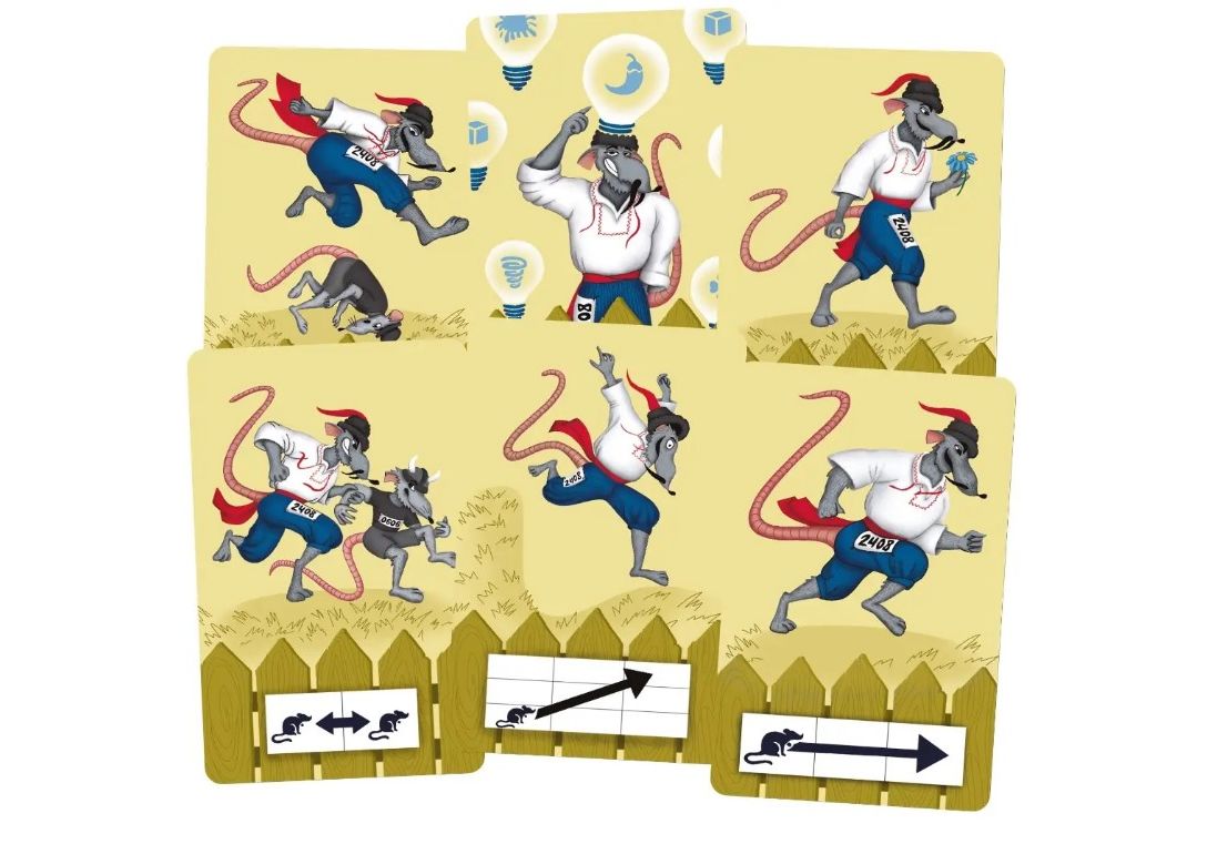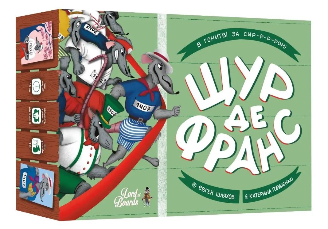 Увага! Увага! Зовсім незабаром починаються всесвітньо відомі перегони Щур де Франс! Що, правильно Тур де Франс? То ви щось наплутали, адже ми кажемо про надзвичайні перегони щурів з усього світу, які змагаються не лише за славу, а й за несчисленні гори запашного сиру! Щур де Франс це гра-перегони українського авторства, у якій від 2 до 4 представників щурячого королівства намагатимуться розумом чи спритністю перехитрити у перегонах усіх своїх супротивників! Чому ніхто не будує просторий гоночний трек? Завжди на шляху постають перешкоди! Перед початком забігу необхідно з купи модульних фрагментів обрати картку старту та фінішу, а також одну або декілька карт самого маршруту, від яких залежатиме і складність перешкод, і довжина перегонів. А на дорозі ще й купа калюж, багнюки та стін, які треба оминати, аби не застрягти у них у найнеочікуваніший момент. На старт! Увага! Щур! Щури-гонщики дуже розумні стратеги, тому завчасно планують усі свої дії. Гравцям же відповідно треба обрати карту руху перед початком раунду забігу – стрімкий ривок по лінії, невеличкий крок в сторону, стрімкий стрибок через суперника або взагалі хитрий обмін місцями з іншим гонщиком. І, звичайно, ще й особлива дія, яка може дати неочікувану перевагу! Але ці ж щури-гонщики ще й дуже поважні пани і заради видовищності на змаганнях не стануть виконувати ту саму дію, що вже зробив колега! Тому, відкриваючи карту дій, перший з гравців виконує її спокійно, але якщо наступні дії повторюють вже розіграну – їх треба замінити, та не аби-як, а у чітко визначеному перед забігом порядку! Тож якщо настілки-перегони виявляються вам до душі, а також ви бажаєте випробувати талант до розробки ігор від українського автора – обов’язково придбайте напружену і азартну настілочку Щур де Франс. А на додачу, в коробочці з грою лежить ще й модуль «Вітер», який вносить коригування навіть у найнадійніший план!