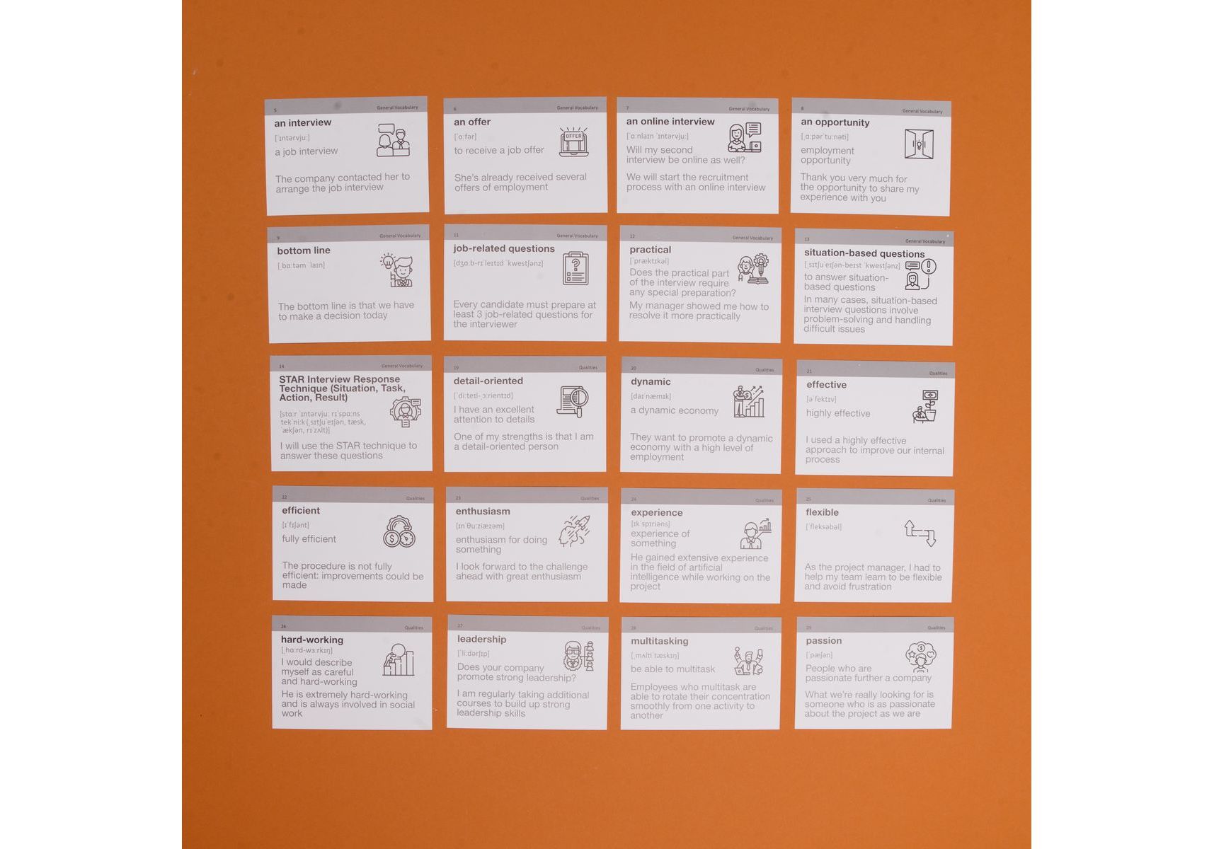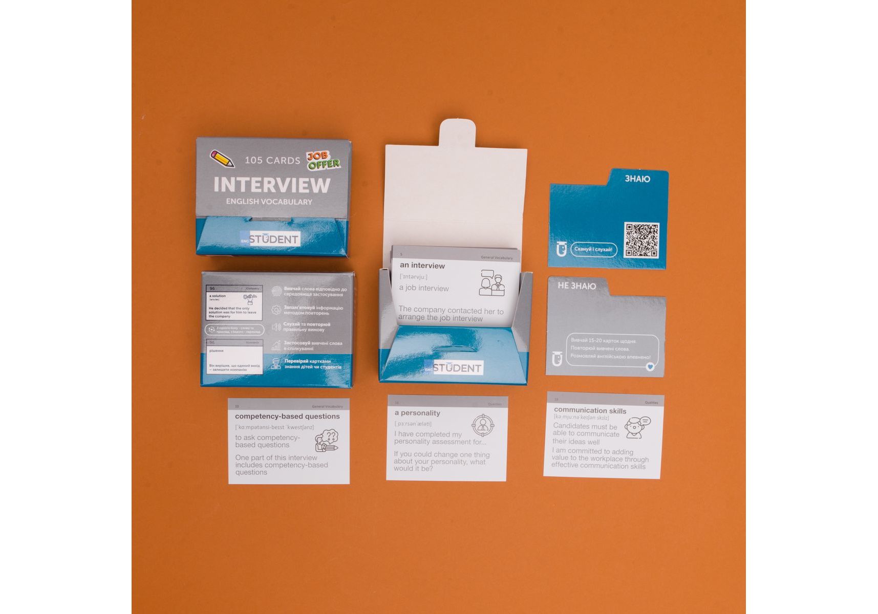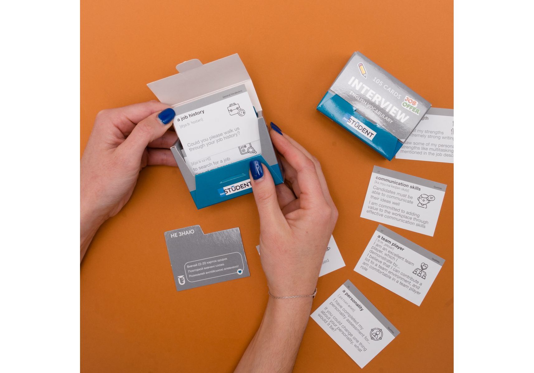 Собеседование — часто очень волнительные и страшный этап приема на работу. Волнение и нервы туманят голову и сбивают с толку. А особенно, если это собеседование на английском. Набор «Interview» — это карточки, которые упростят подготовку к интервью. В 105 карточках мы собрали самую нужную лексику, которая понадобится во время разговора. А дополнительное аудиосопровождение к каждому слову и фразе поможет запомнить правильное произношение и произвести впечатление опытного специалиста. 5 причин выбрать карточки от English Student: Изучай! Слова в соответствии к среде использования Запоминай! Информацию методом повторений Слушай и запоминай! Правильное произношение Применяй! Изученные слова в общении Проверяй! Карточками знания детей или студентов В набор входит: • 105 карточек со словами • разделители «Знаю» и «Не знаю»