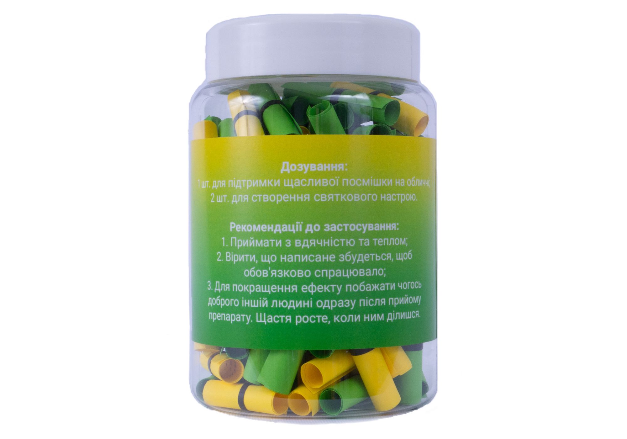 Количество записок: 100 шт. Баночка объемом 400 мл., высотой: 112,5 мм., диаметром: 75 мм. Цвет бумаги и этикетки: зеленый с желтым. Сделано вручную в Украине.
