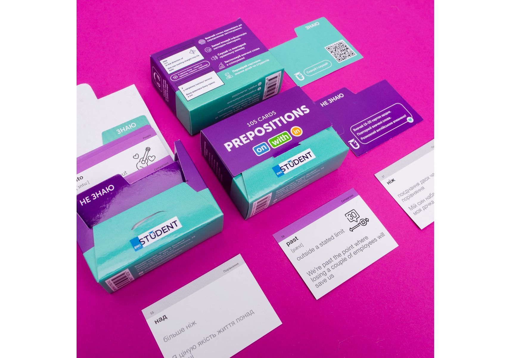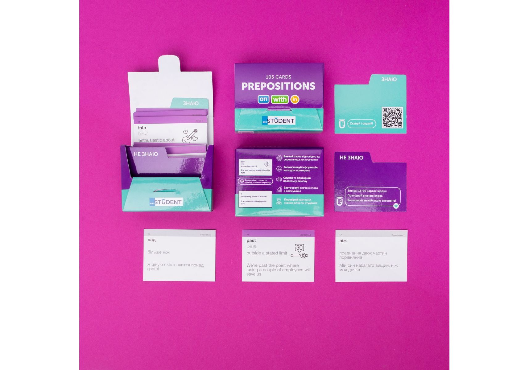 Набор «Prepositions» — карточки с английскими предлогами. С этой частью речи у многих студентов возникают проблемы, ведь, чтобы хорошо их освоить, нужно выучить, какие формы и виды предлогов существуют. А также как правильно применять их вовремя построения предложения. Особенность предлогов состоит в том, что их форма постоянная и не меняется. В отличие от существительного или глаголов, например. В наборе собрано 105 самых популярных предлогов. К каждому из них на карточке есть правило и пример употребления.